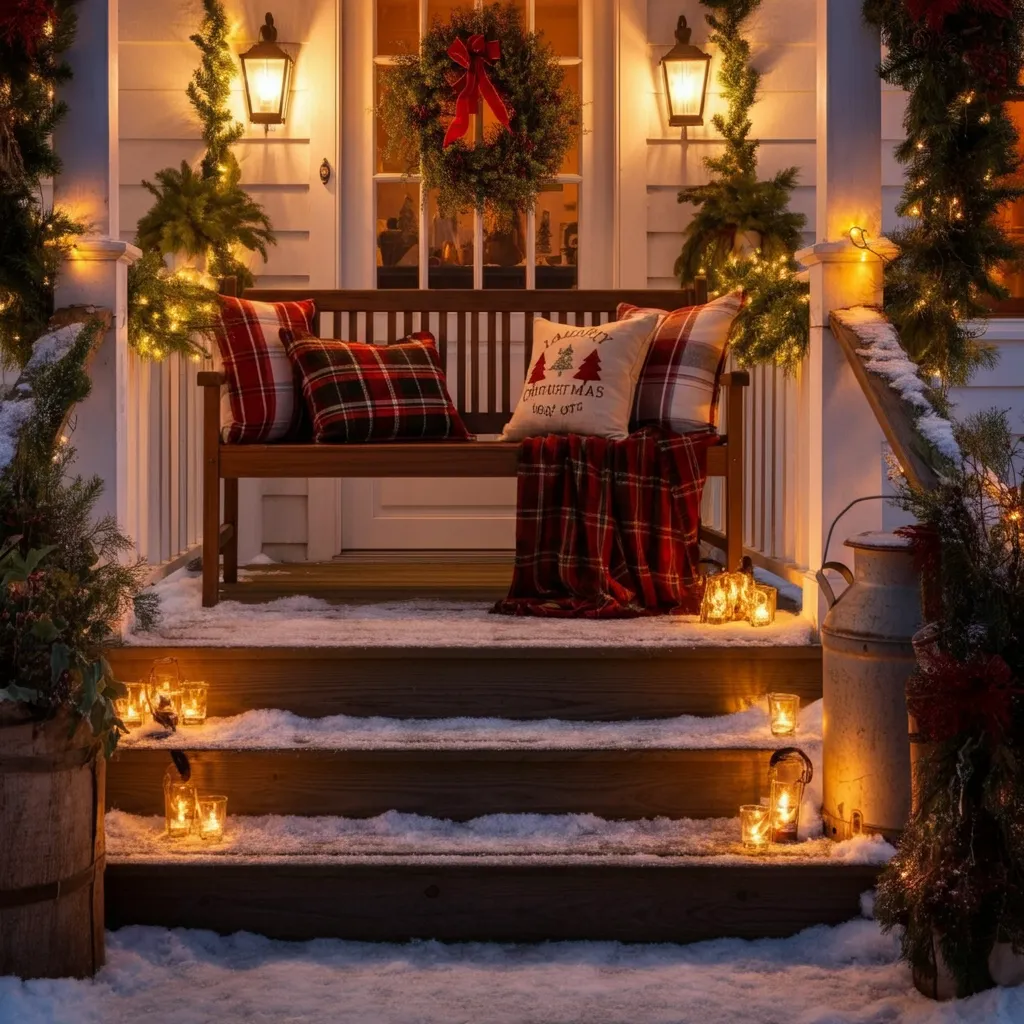 If space allows, add a wooden bench or rocking chair adorned with plaid blankets and festive throw pillows. This not only looks inviting but also provides a cozy spot to enjoy a cup of hot cocoa.