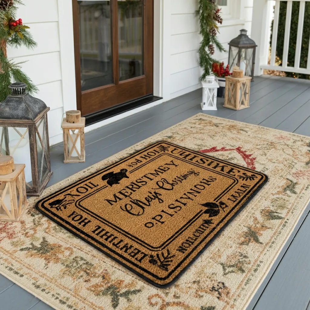 Welcome guests with a festive doormat featuring rustic designs or holiday greetings. Pair it with a layered rug underneath for extra texture and style.