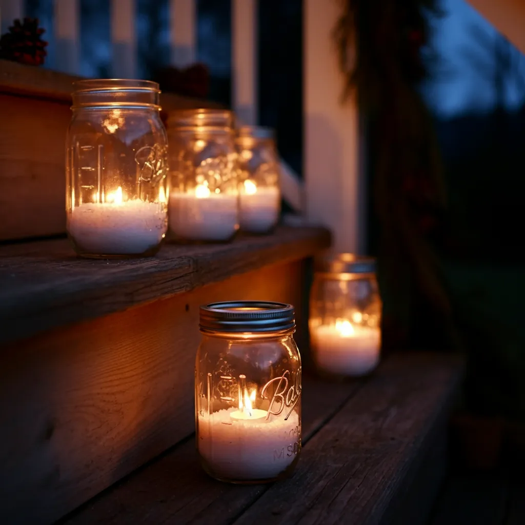 Fill mason jars with Epsom salt to mimic snow and place tea lights or small candles inside. Line them up along your steps or porch railing for a charming glow.