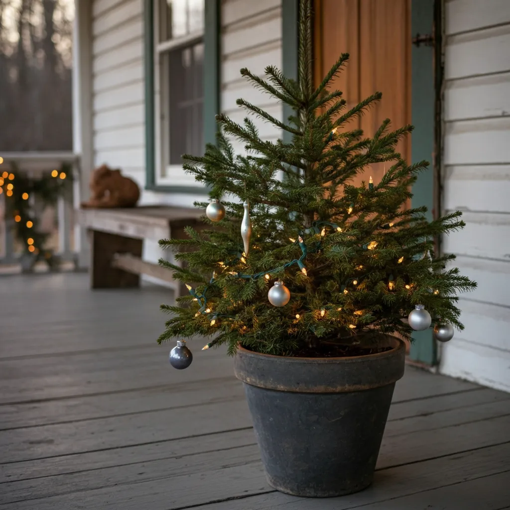 A small, potted Christmas tree decorated with simple ornaments and twinkling lights can be the centerpiece of your porch. Choose a tree with a natural, untrimmed look for added charm.