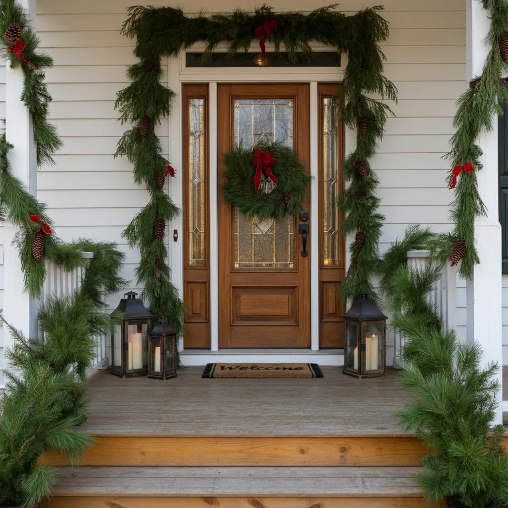 Drape garlands of fresh pine, cedar, or eucalyptus around your doorframe or railings. Add pinecones and red berries for a pop of color and texture.