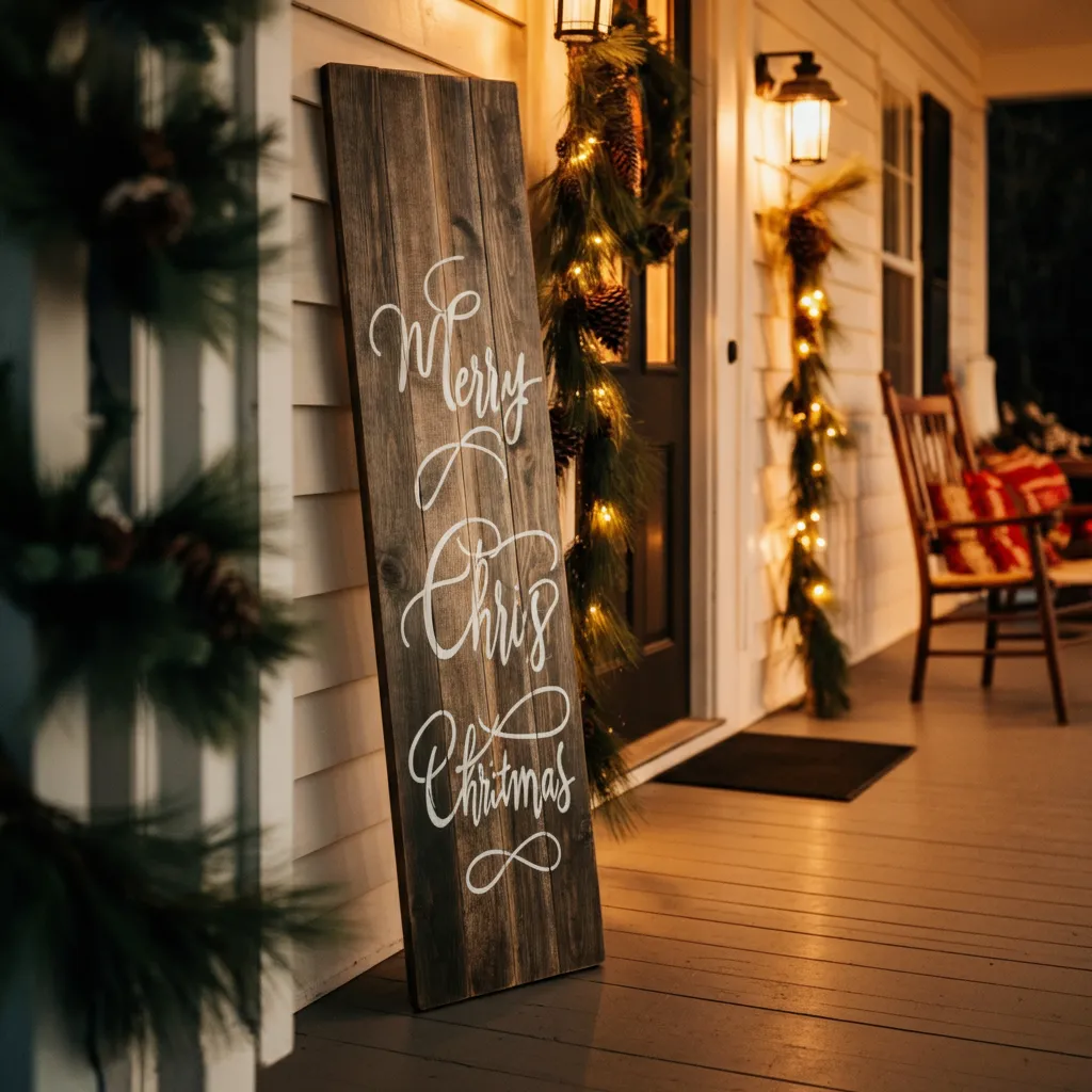 A hand-painted wooden sign with festive phrases like “Merry Christmas” or “Joy to the World” sets the tone for your rustic porch. Opt for distressed wood or reclaimed barn wood for an authentic farmhouse feel.