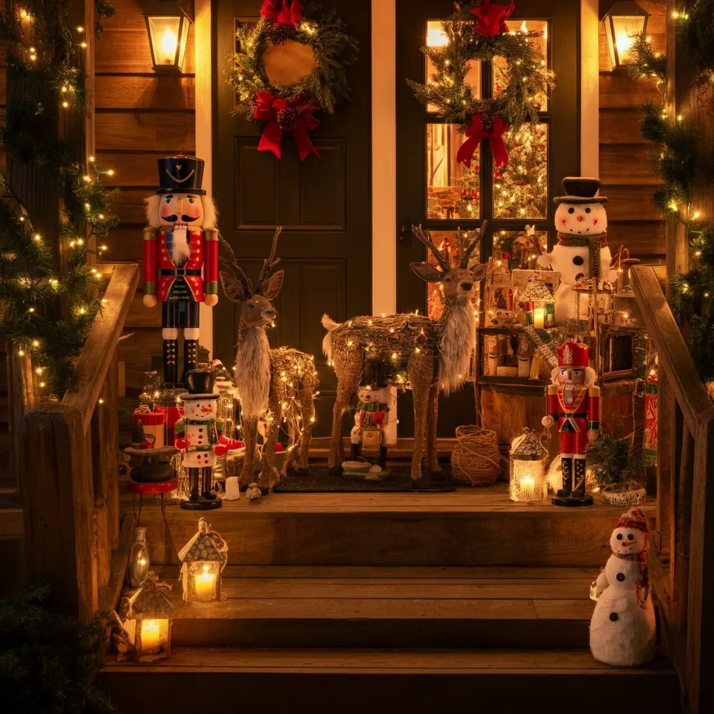 Add a touch of whimsy with rustic figurines like wooden reindeer, snowmen, or nutcrackers. Place them strategically around your porch for a playful yet elegant look.