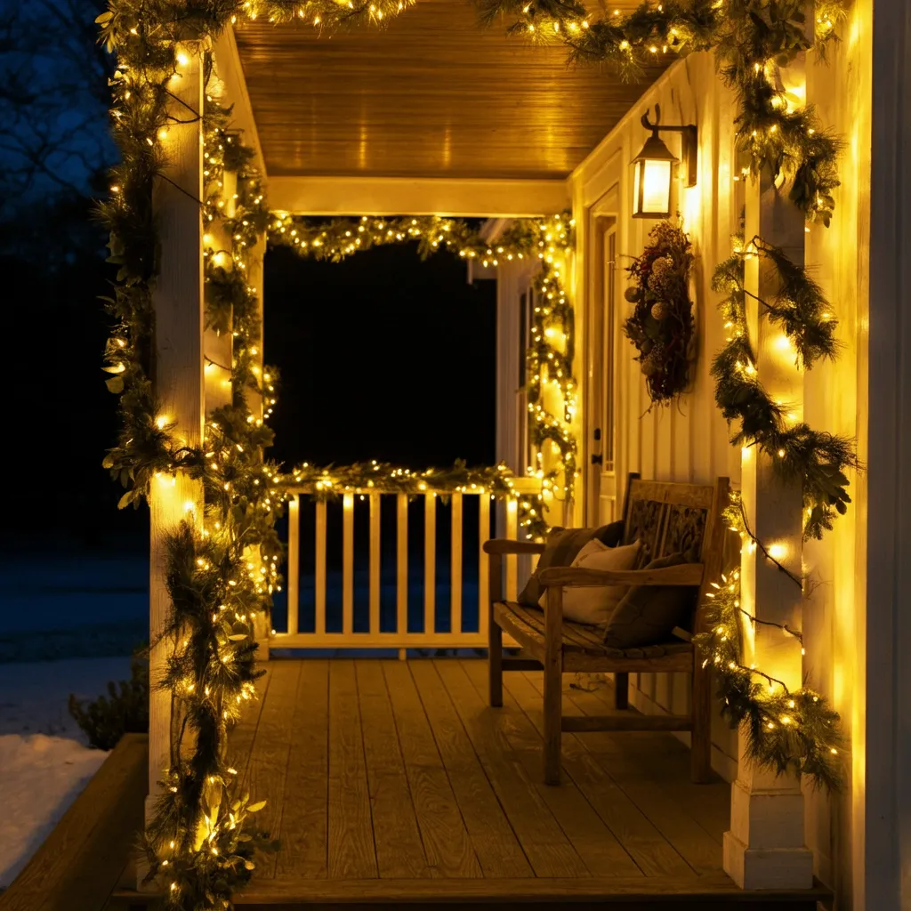 Twinkling string lights are a simple yet effective way to add warmth and sparkle to your porch. Wrap them around railings, columns, or even your greenery for a festive touch.
