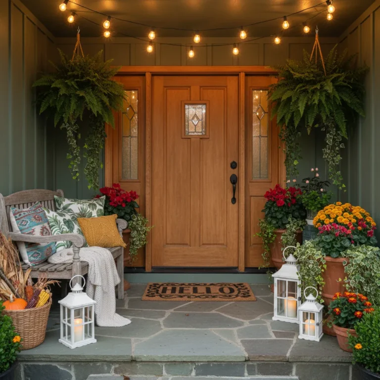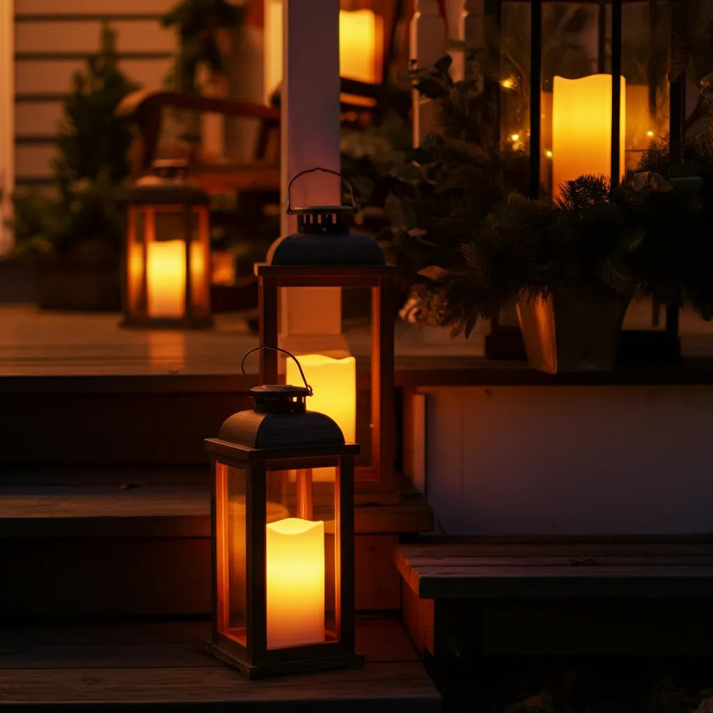 Place vintage-style lanterns filled with LED candles or fairy lights on your porch steps or side tables. The soft, flickering light creates a magical ambiance.