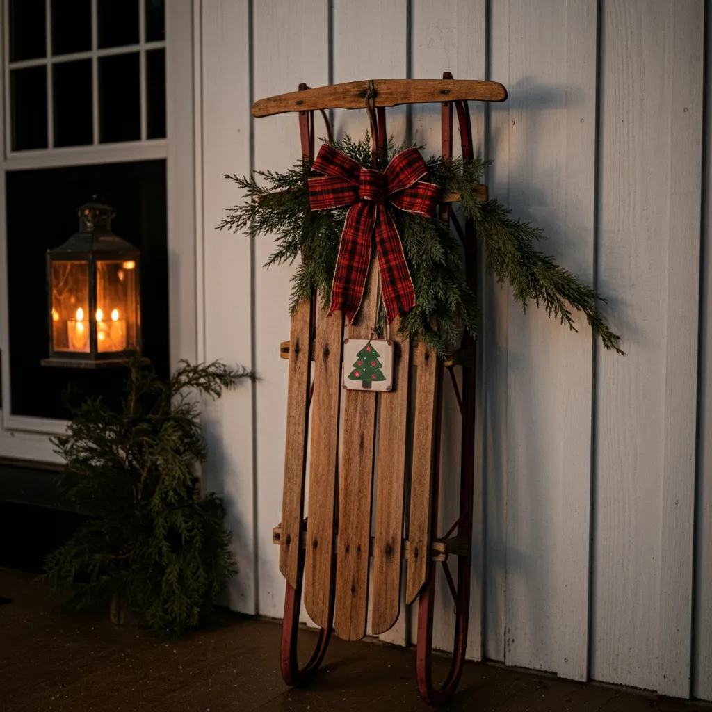Lean an old wooden sled against the wall or prop it up near the door. Decorate it with a bow, greenery, or a small sign for a nostalgic holiday vibe.