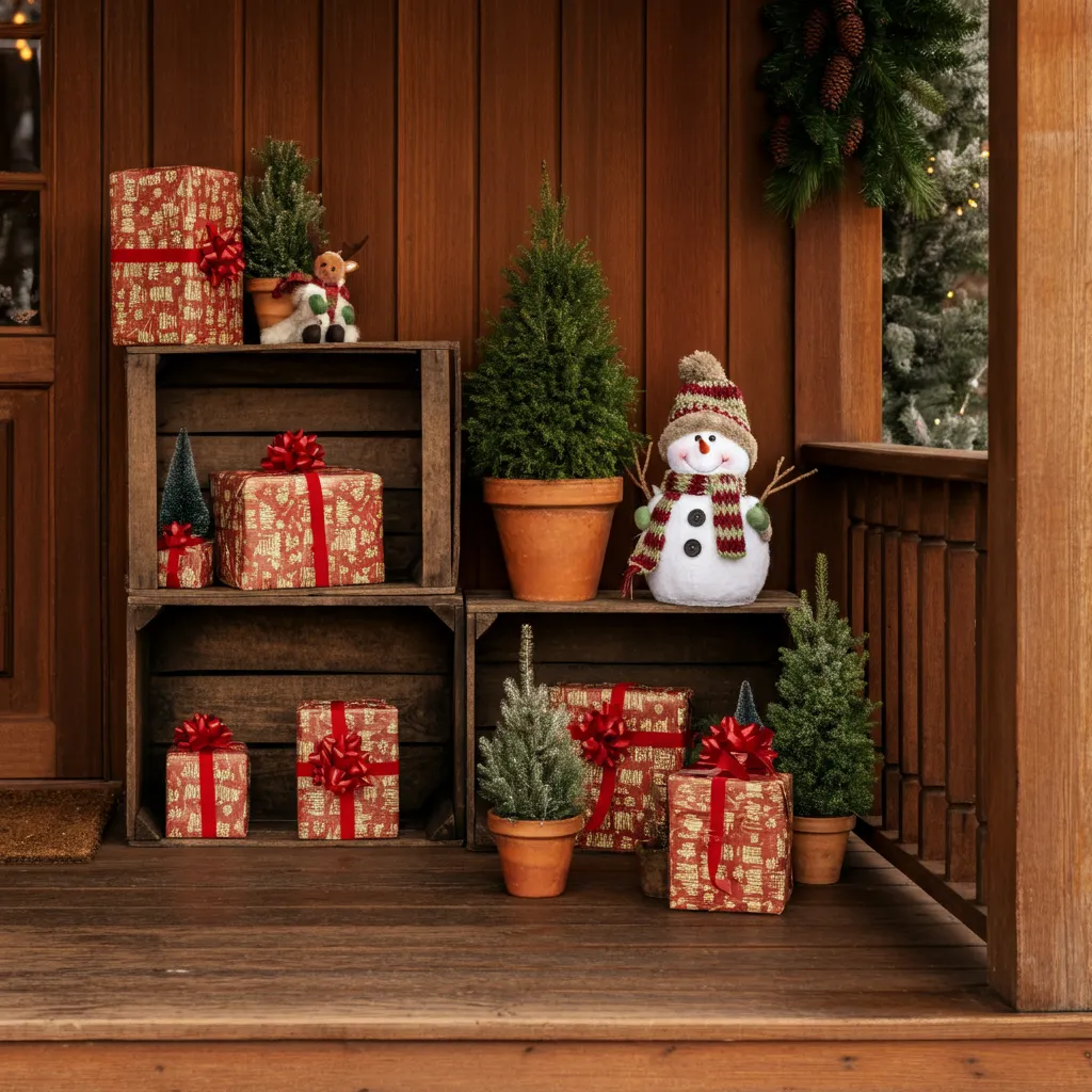 Stack wooden crates to create a tiered display for small potted evergreens, wrapped presents, or seasonal figurines. This adds height and visual interest to your decor.