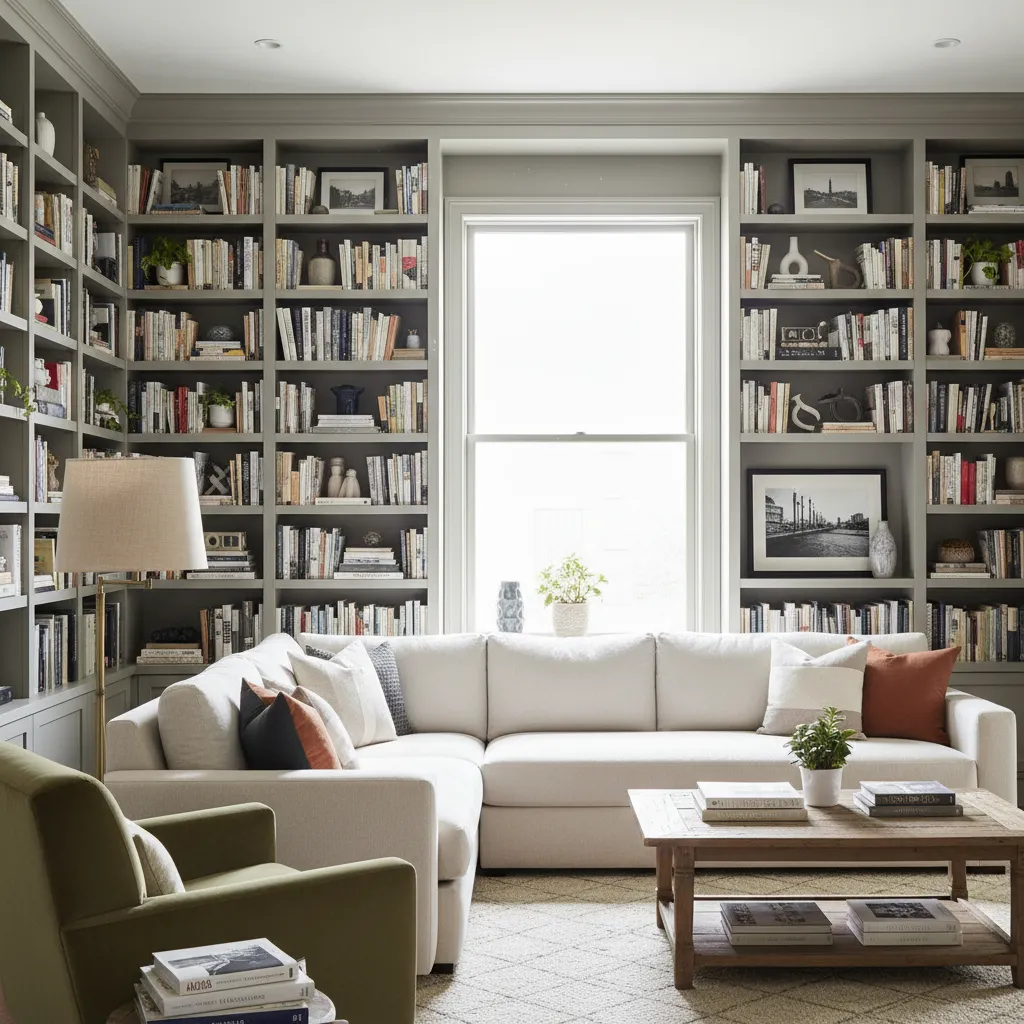 Turn your accent wall into a functional library. Floor-to-ceiling built-ins provide massive amounts of storage while displaying your personality through books and curios.