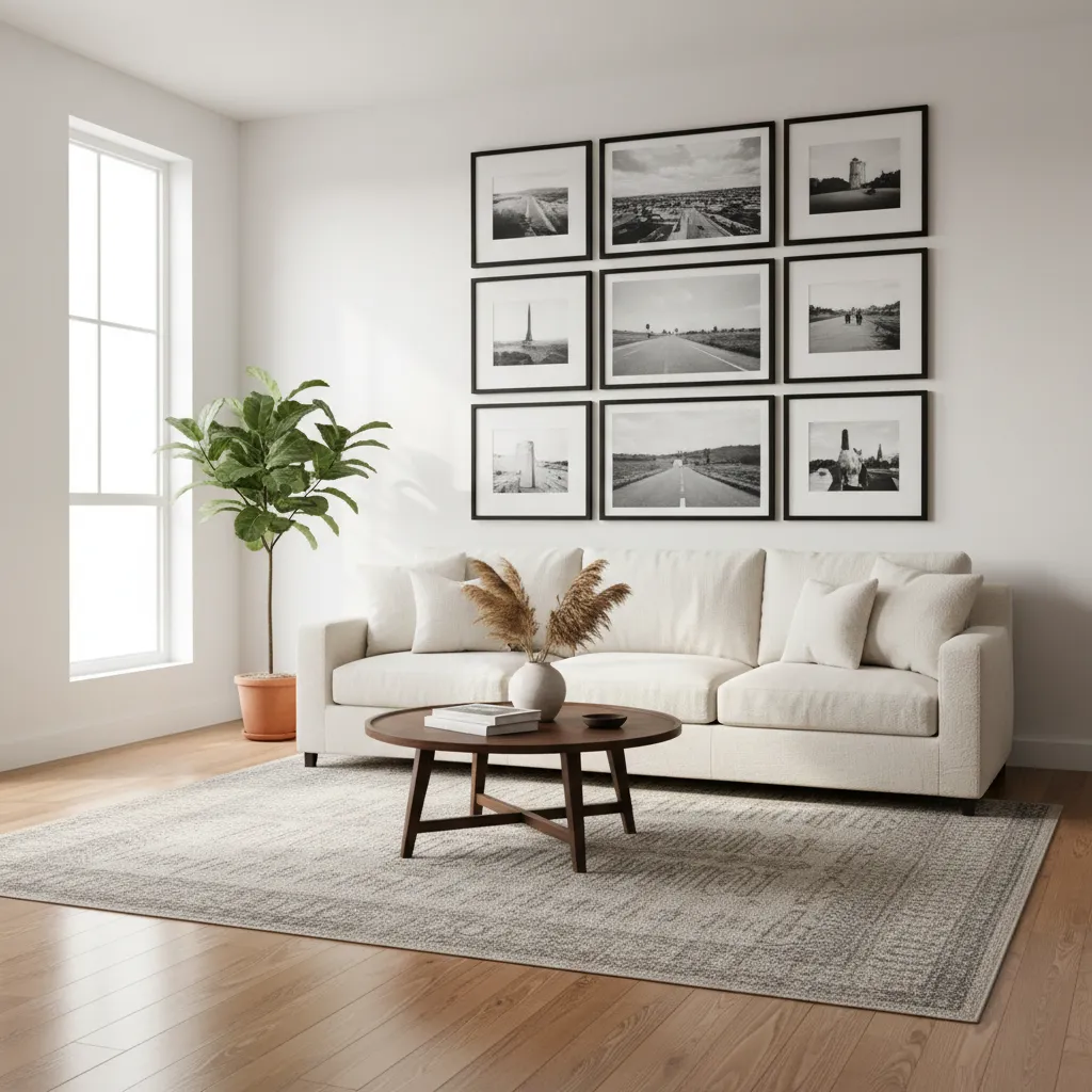 Instead of a single material, use your memories as the accent. A structured floor-to-ceiling gallery wall filled with matching frames creates a powerful visual statement.