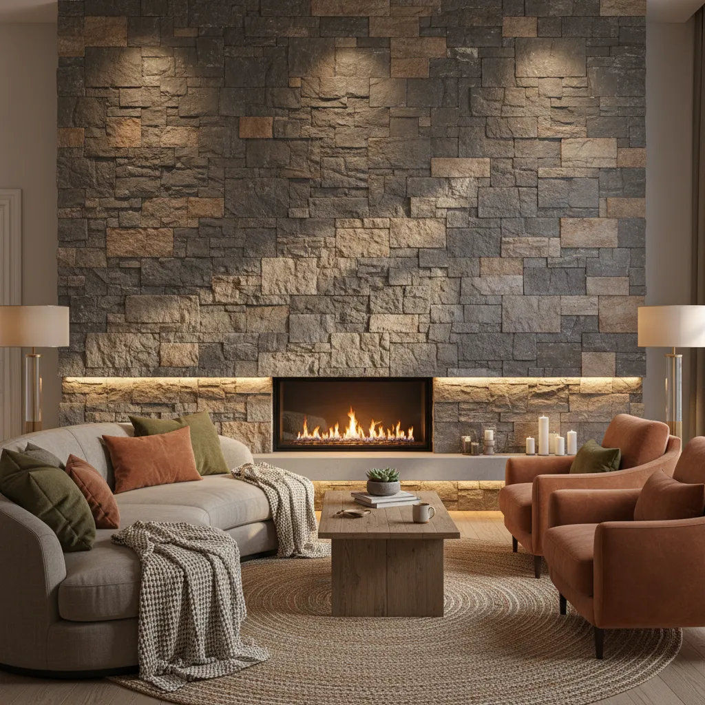 Bring the outdoors in with stacked stone. This adds a rugged, earthy element that pairs perfectly with fireplaces or large windows. It’s one of those decor ideas that immediately makes a room feel like a lodge or a retreat.