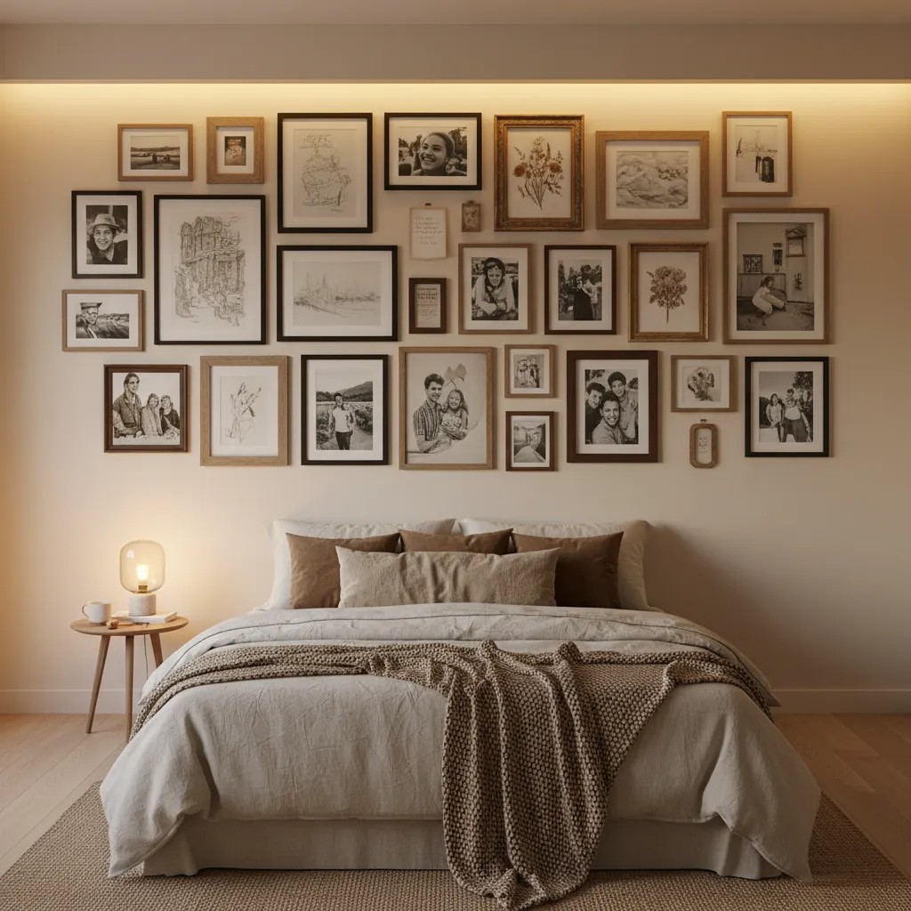Make your bedroom uniquely yours by creating a gallery wall of your favorite art, photos, and mementos. Mix frames of different sizes and finishes for an eclectic look, or stick to a uniform style for a more cohesive feel. This is a wonderful way to surround yourself with things that bring you joy and inspiration. For more ideas on how to adorn your vertical spaces, explore these Bedroom Wall Decor Ideas.