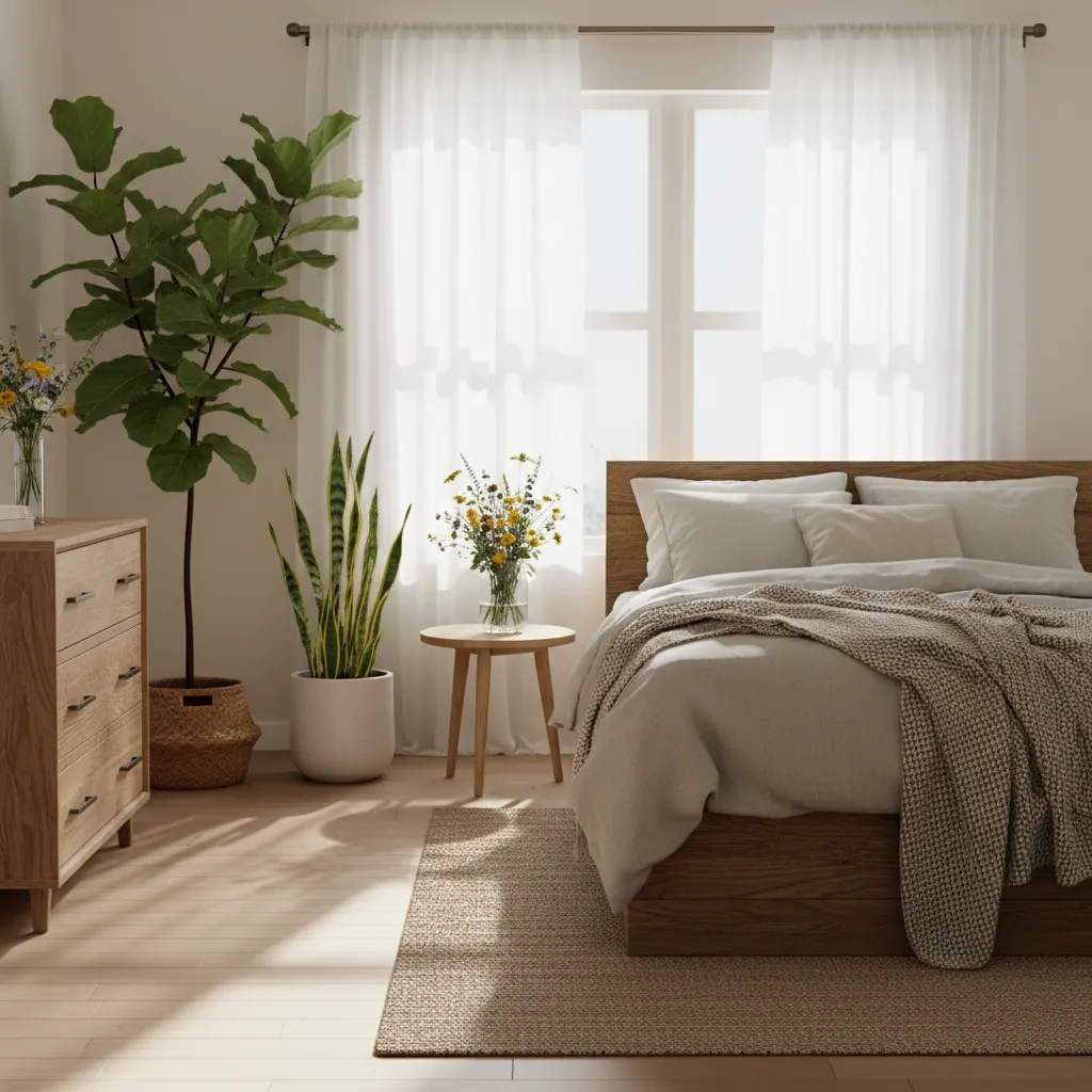 Bringing the outdoors in is a fantastic way to create a calming environment. Place potted plants like snake plants or pothos on your nightstand or a larger fiddle leaf fig in a corner. These not only purify the air but also add life and a splash of vibrant green. Other natural elements like wooden furniture, wicker baskets, or a vase of fresh flowers can also enhance the room’s serene, organic feel. These elements are also perfect for anyone looking for inspiring Bedroom Design Ideas for Men that feel grounded and sophisticated.