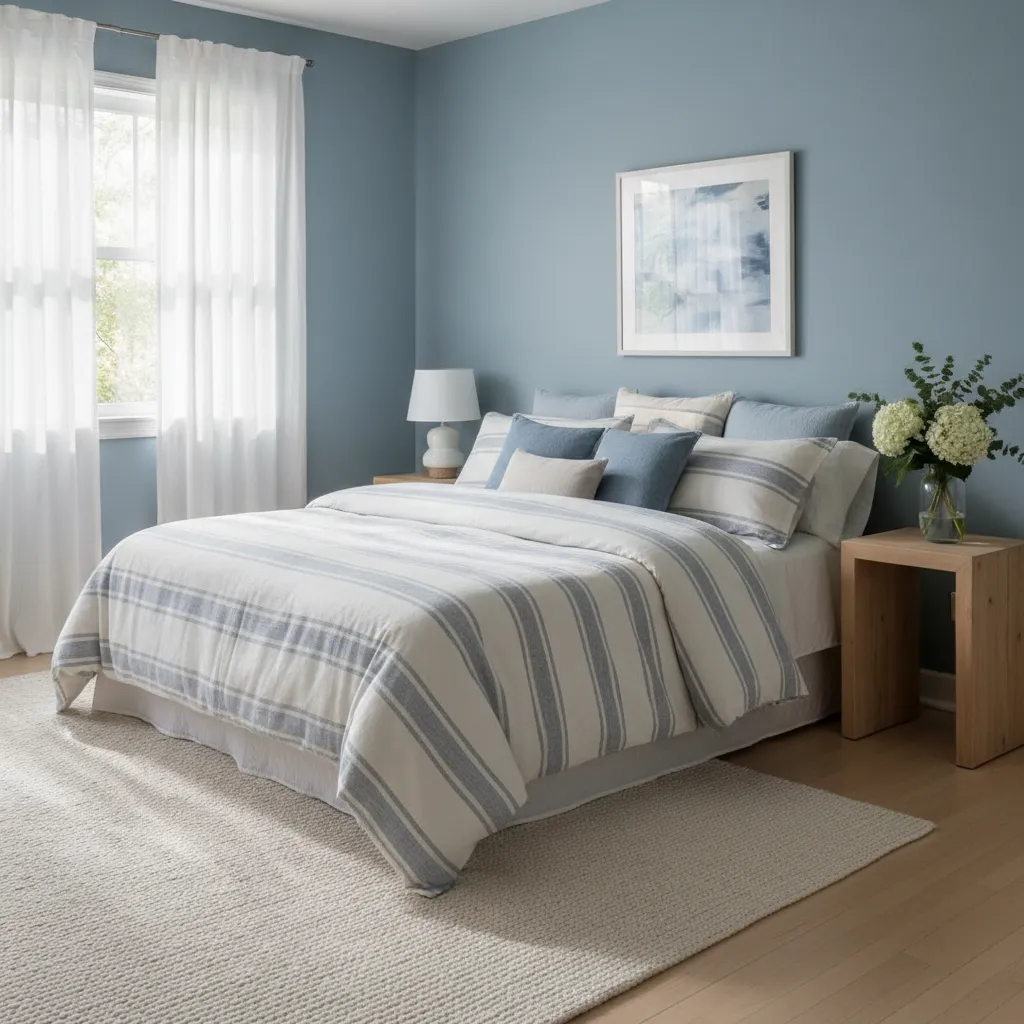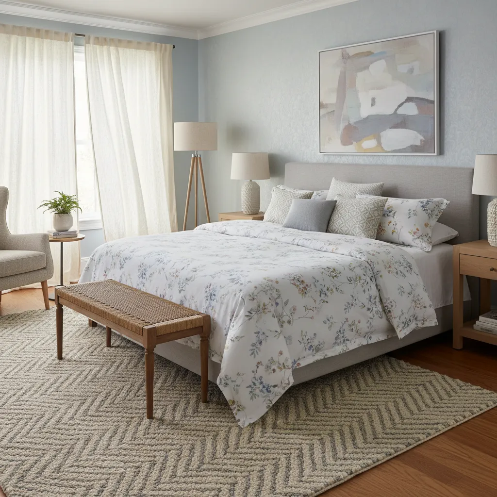 While a soothing color palette is key, that doesn’t mean your room has to be plain. Introduce subtle patterns through your textiles, like a duvet cover with a delicate floral print, curtains with a faint geometric design, or a rug with a classic herringbone pattern. These add visual texture and depth without disrupting the room’s tranquil atmosphere.