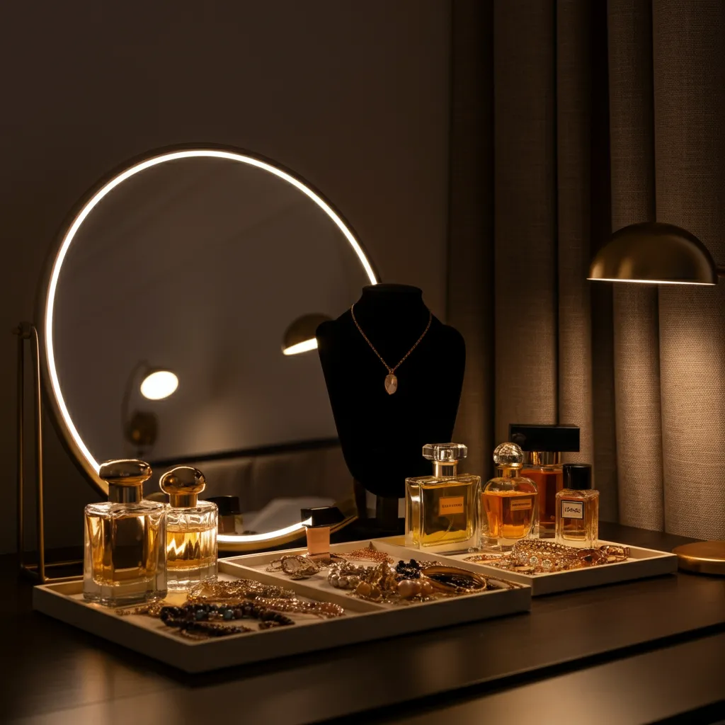 Designate a surface as your personal vanity or dressing area. Organize it with pretty trays for jewelry and perfume, and hang a beautiful mirror above it.
