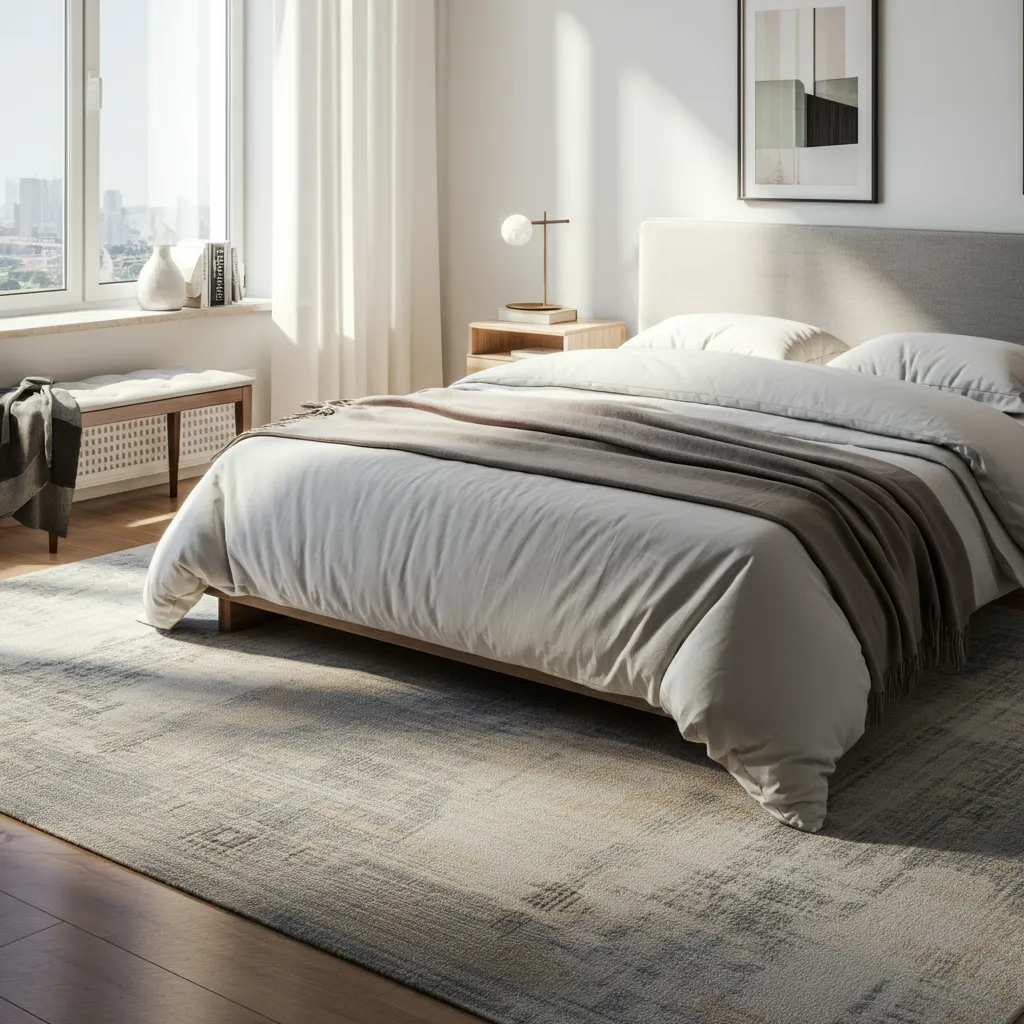 A dreamy bedroom combines soft colors, cozy textures, and calming lighting. Comfortable bedding, layered rugs, and thoughtful decor help create a peaceful, inviting atmosphere perfect for rest and relaxation.