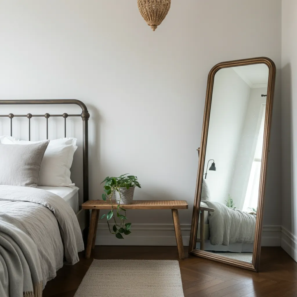 A large, beautifully framed mirror can make your bedroom feel larger and brighter by reflecting light. A vintage-style ornate mirror or a simple, modern round one can also act as a piece of wall art.