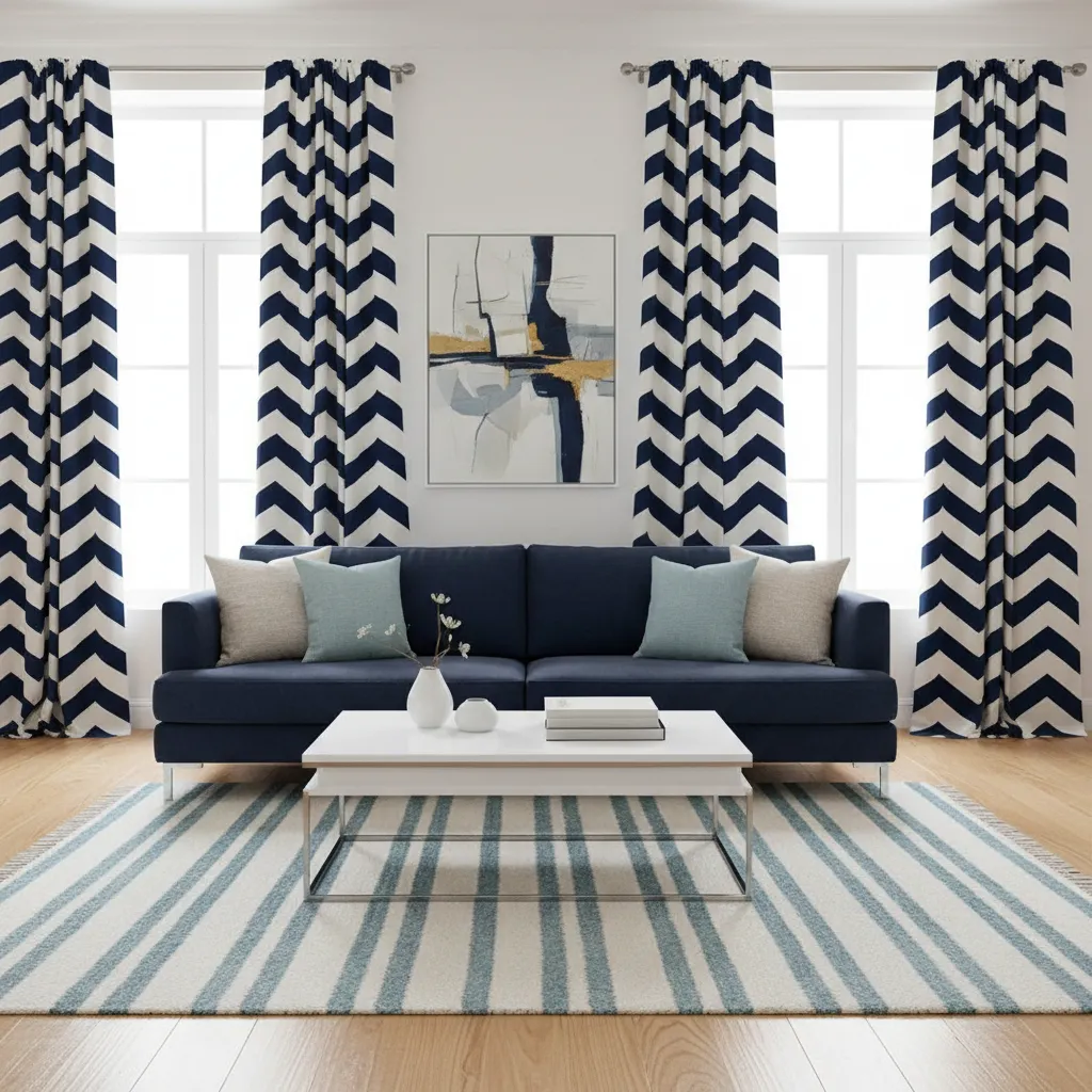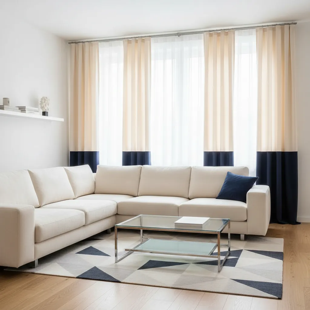 Color-blocked curtains feature a wide stripe of one color and another block of a different color. A common design places a thick band of navy at the bottom and cream at the top. This design looks tailored and modern, keeping the upper part of the room light while anchoring the floor with dark blue.