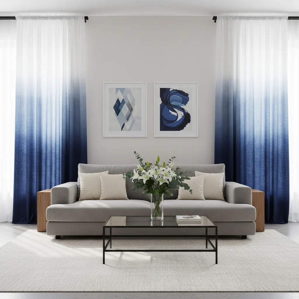 Ombre curtains transition smoothly from white at the top to deep indigo at the bottom. This gradient effect draws the eye upward, making your ceilings appear taller. It is a creative way to incorporate blue without darkening the top half of your windows.