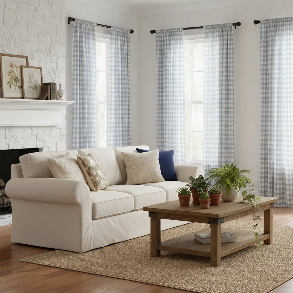 Denim isn’t just for jeans. Soft denim blue cotton curtains are durable, easy to wash, and incredibly versatile. They add a casual, family-friendly vibe to the living room. If you want to update your space for spring and summer, denim pairs perfectly with Dreamy Farmhouse Summer Decor Ideas.