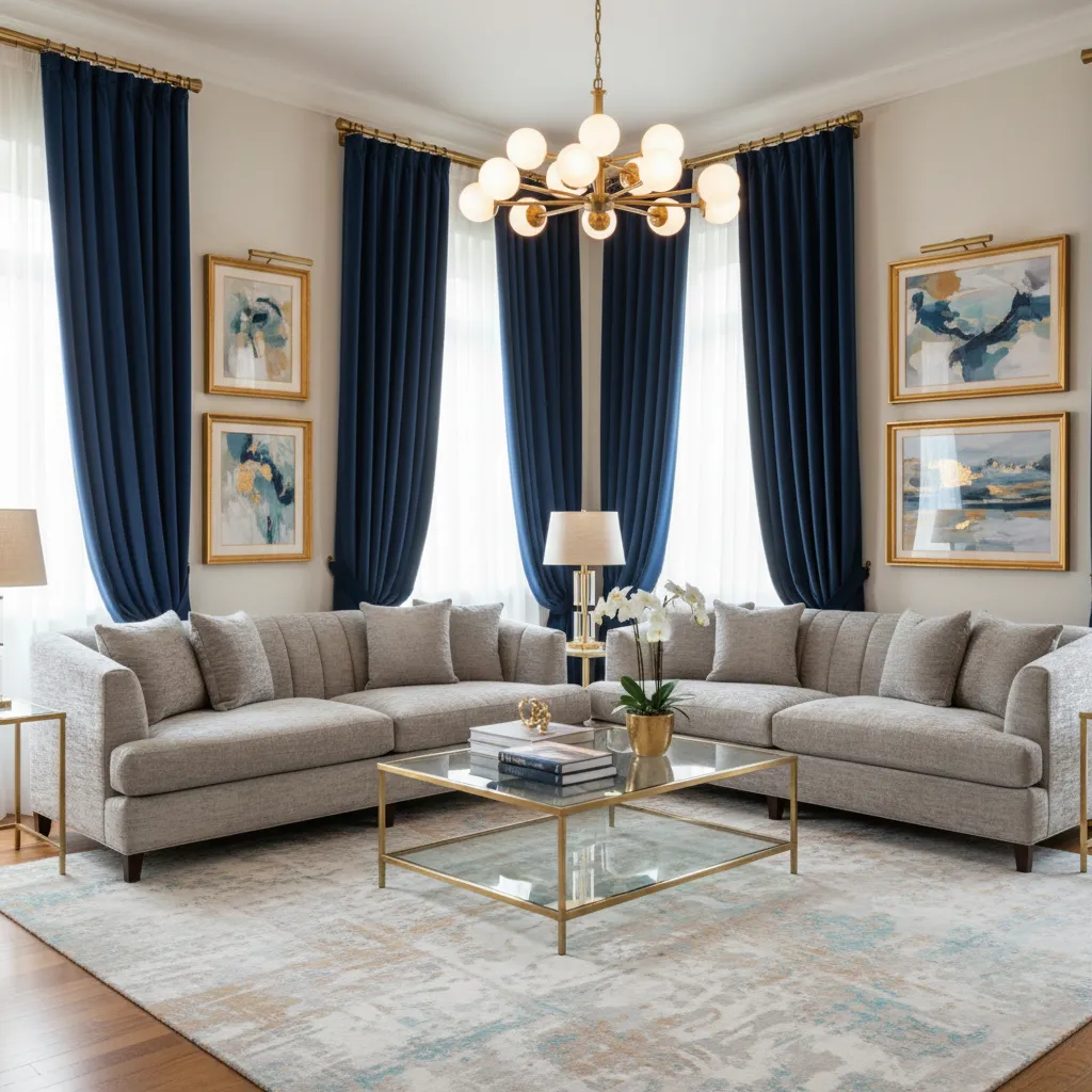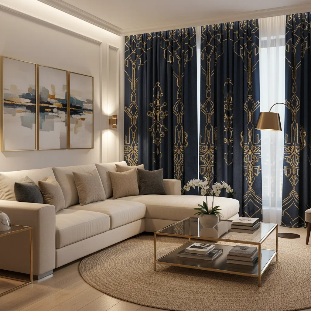 Curtains that feature subtle gold foil prints or gold embroidery on a midnight blue background look incredibly chic. The metallic details catch the light and add warmth to the cool blue tones. This combination makes your living room feel like a high-end boutique hotel.