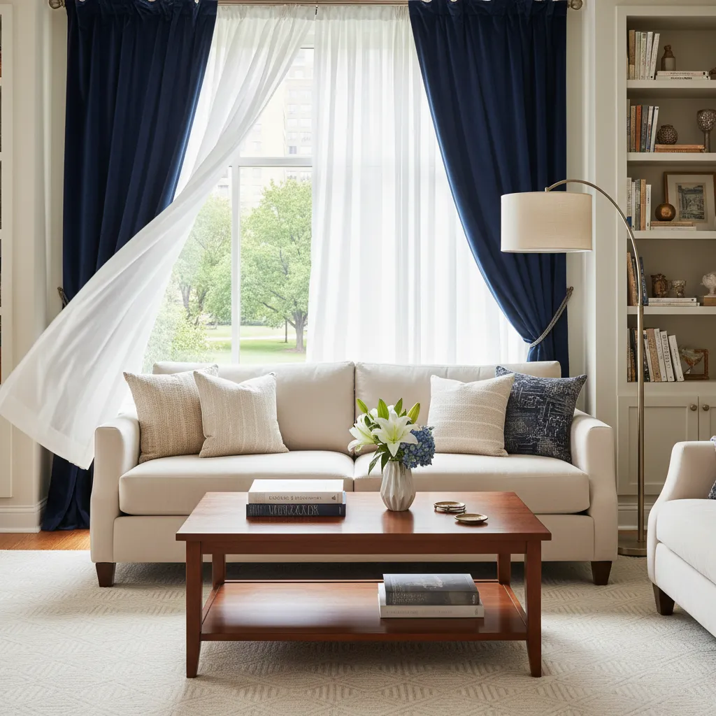 Can’t decide between dark and light? Layer them! Install a double curtain rod and hang sheer white panels closest to the window, with heavy navy panels on the outside. This gives you complete control over light and privacy while adding beautiful depth to your decor.