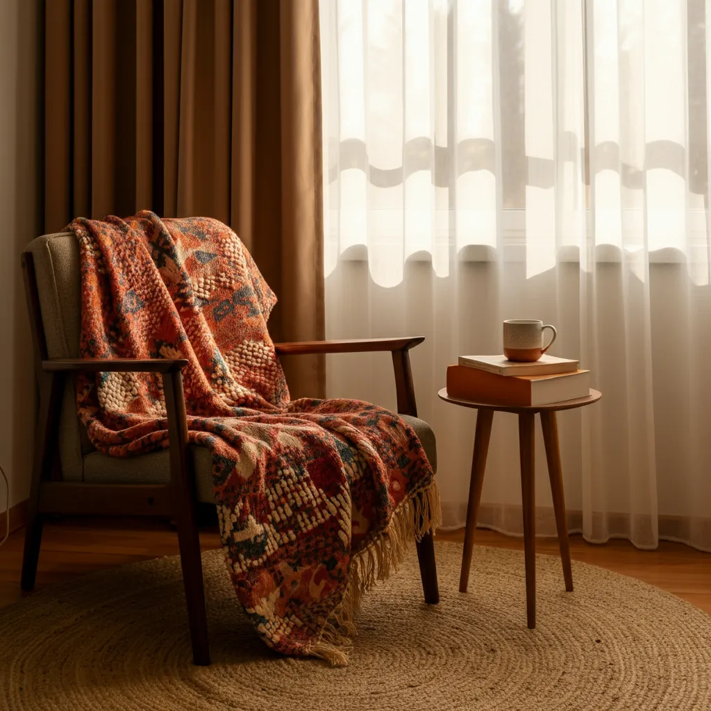Create a cozy corner with a mid-century modern armchair, a boho throw blanket, and a small side table. This is the perfect spot to relax with a good book.