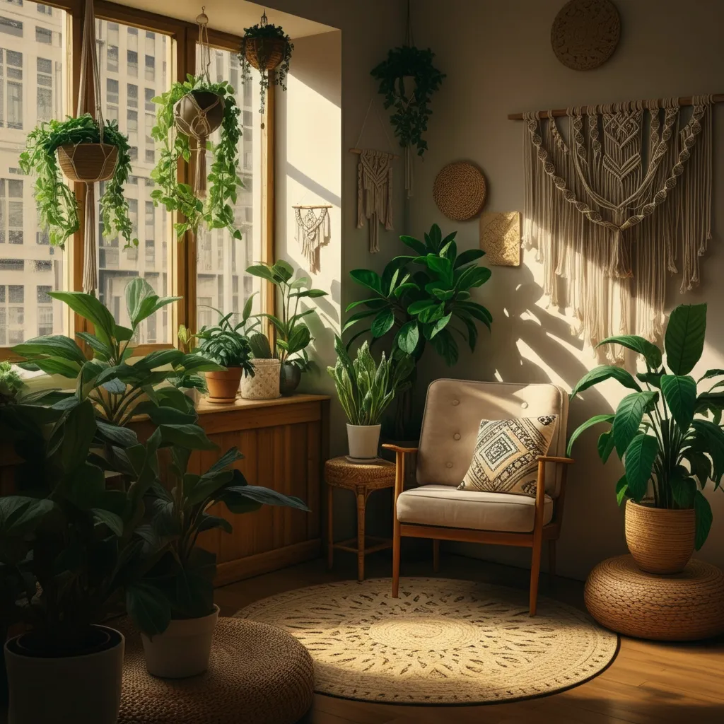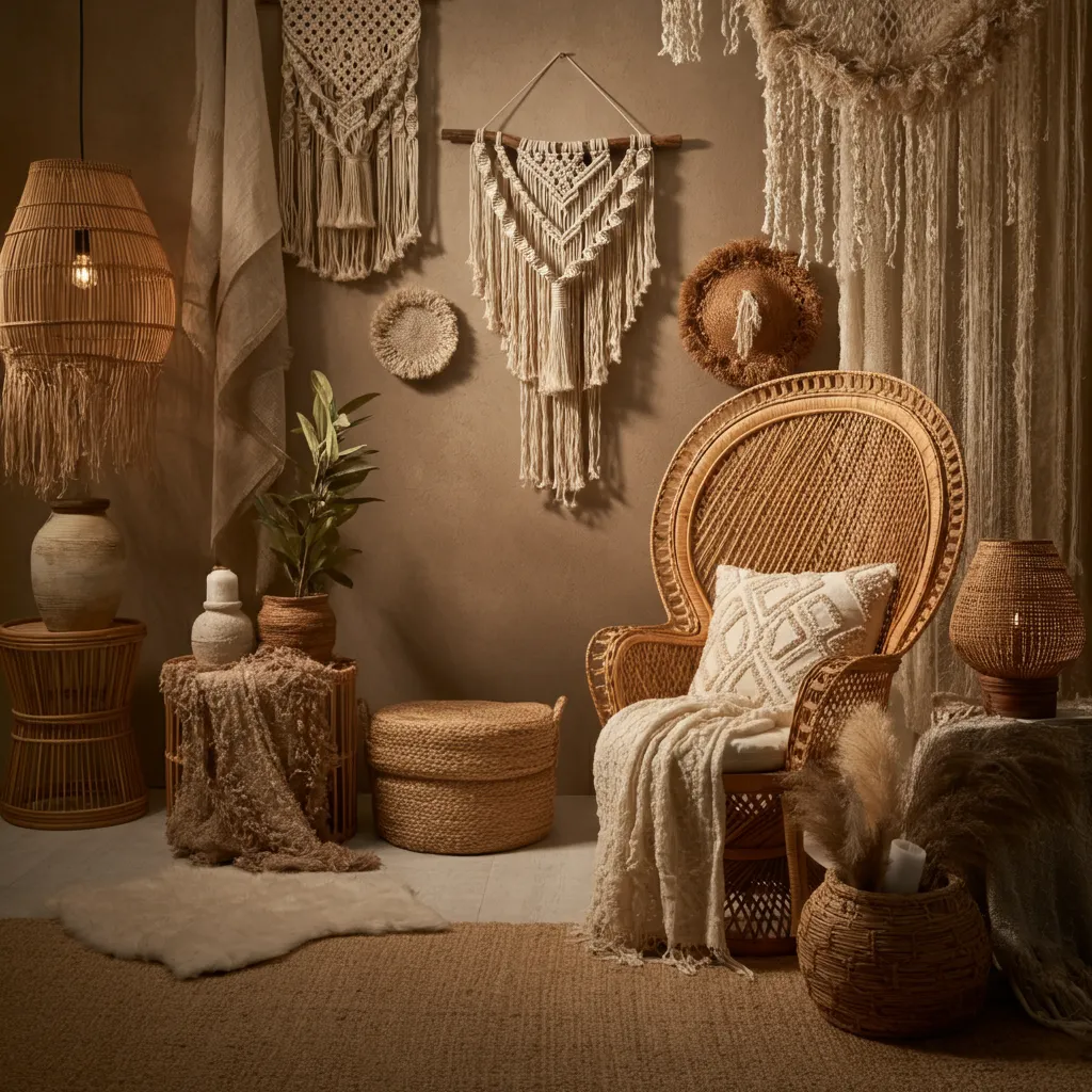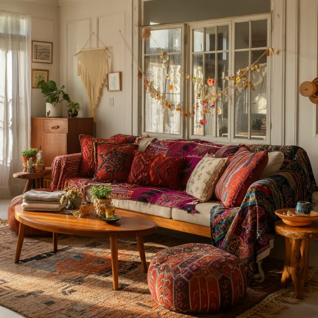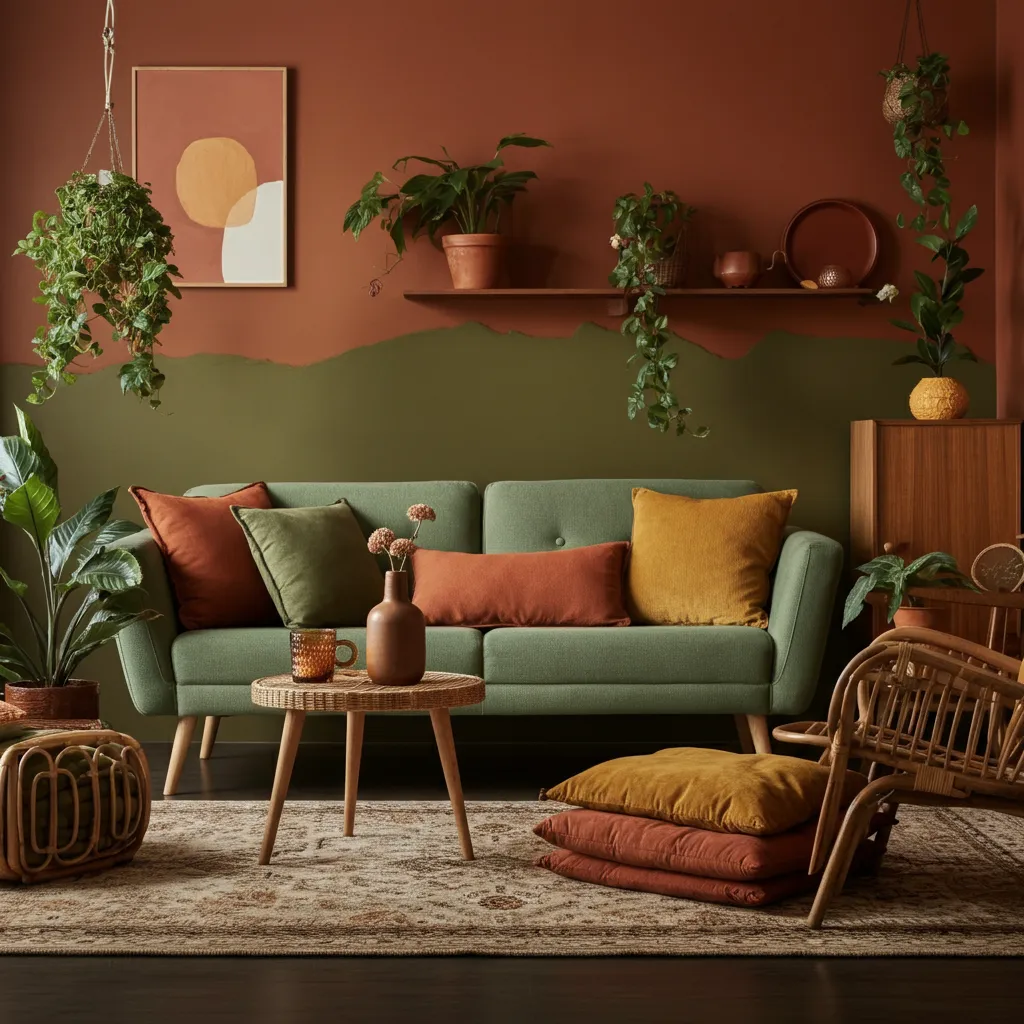 Earthy tones like terracotta, olive green, and mustard yellow are perfect for this style. Use these colors in your decor to create a warm, inviting atmosphere.