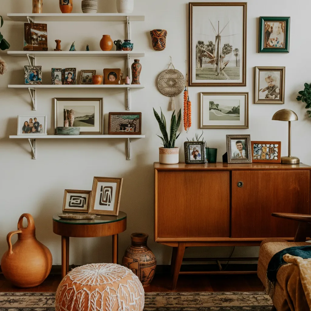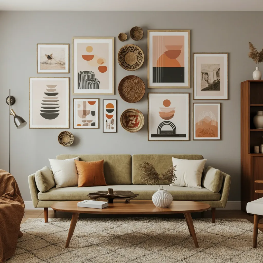 A gallery wall is a great way to showcase your personality. Mix mid-century modern art prints with boho-inspired pieces like woven baskets or macramé hangings for a curated look.