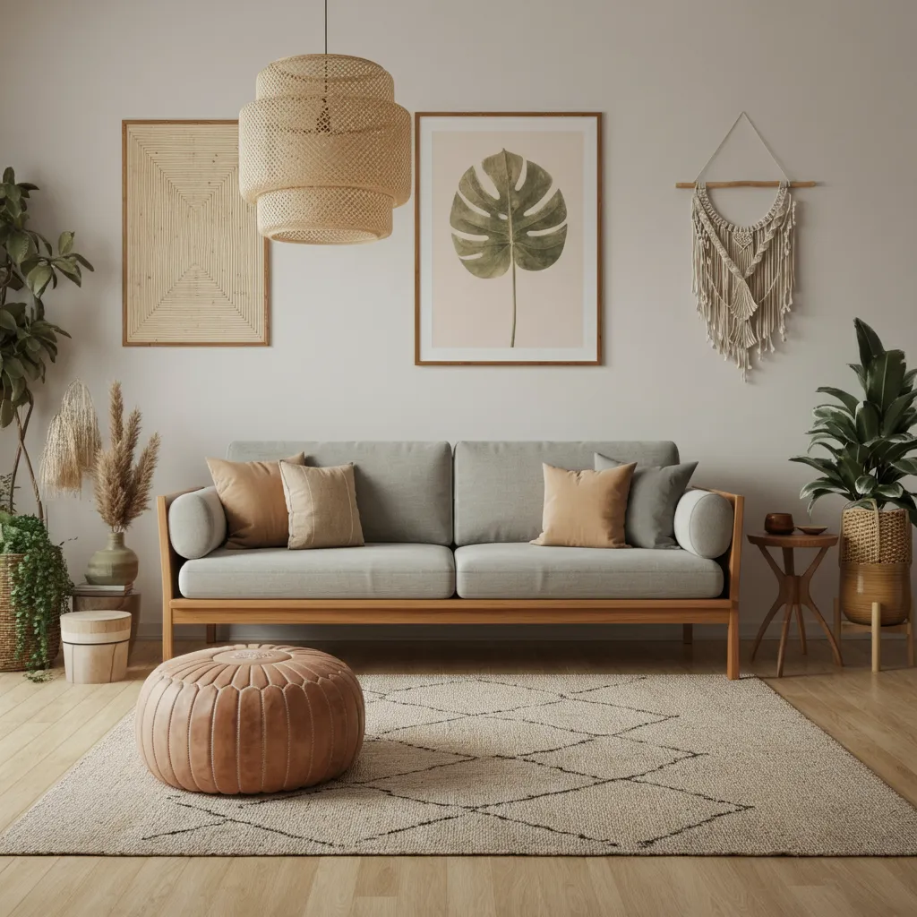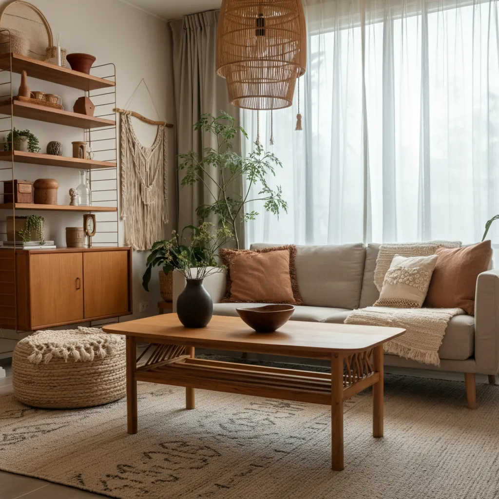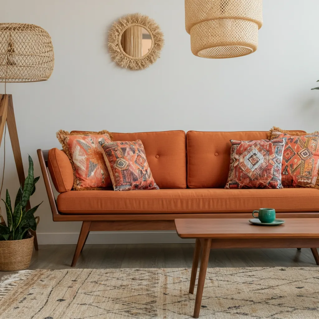Opt for mid-century modern pieces with clean lines and tapered legs, combined with bohemian elements like patterned cushions, poufs, rattan chairs, or layered rugs. Mixing textures like wood, leather, and woven fabrics adds depth.