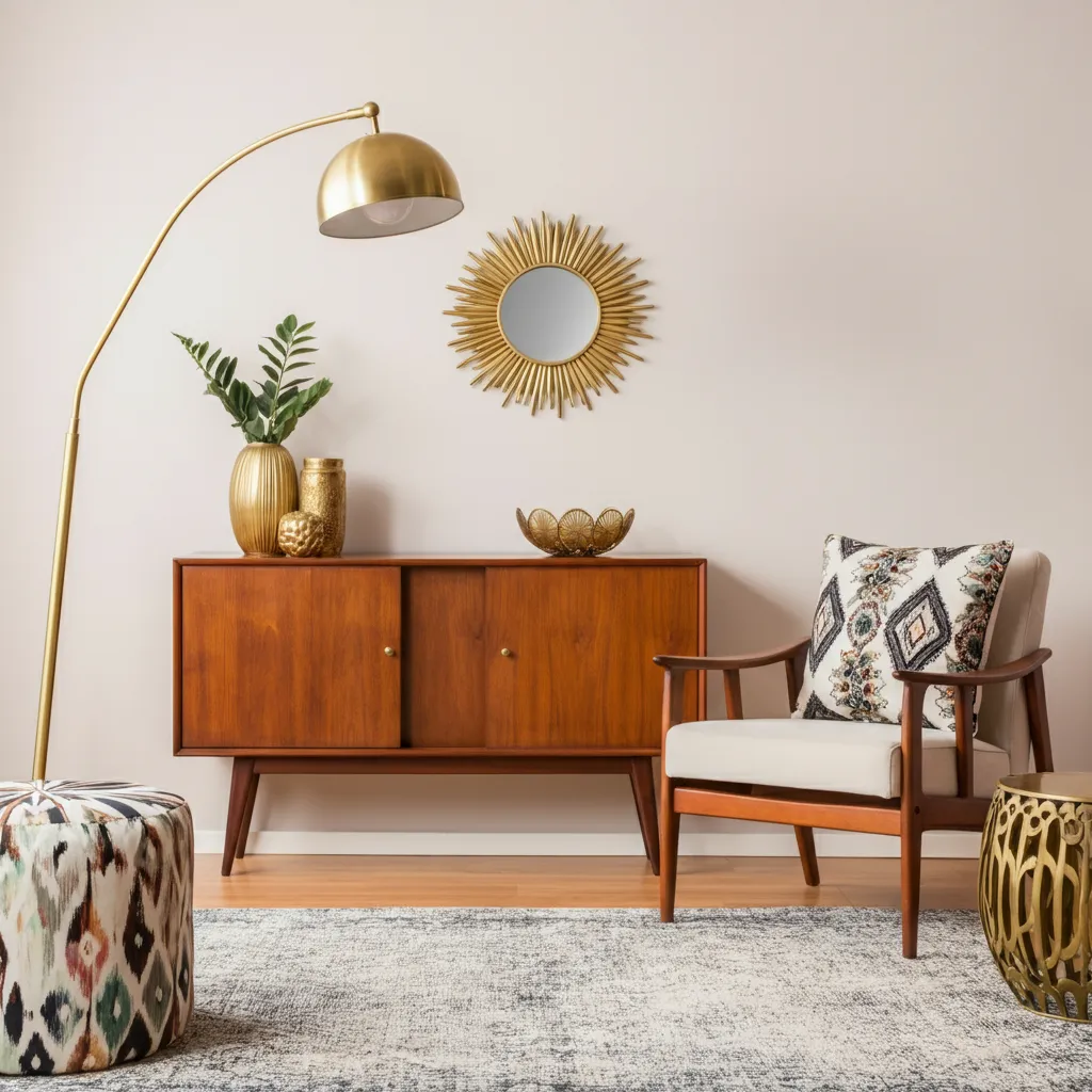 Add a touch of glam with metallic accents like brass or gold. A mid-century modern floor lamp or a boho-style mirror with a gold frame can elevate the look.