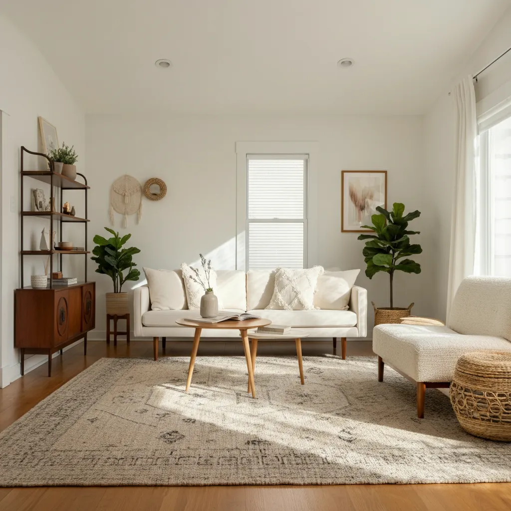 A neutral color palette is the foundation of any boho mid-century modern living room. Think whites, creams, and soft grays for your walls and larger furniture pieces. This creates a clean canvas that allows your decor to shine.