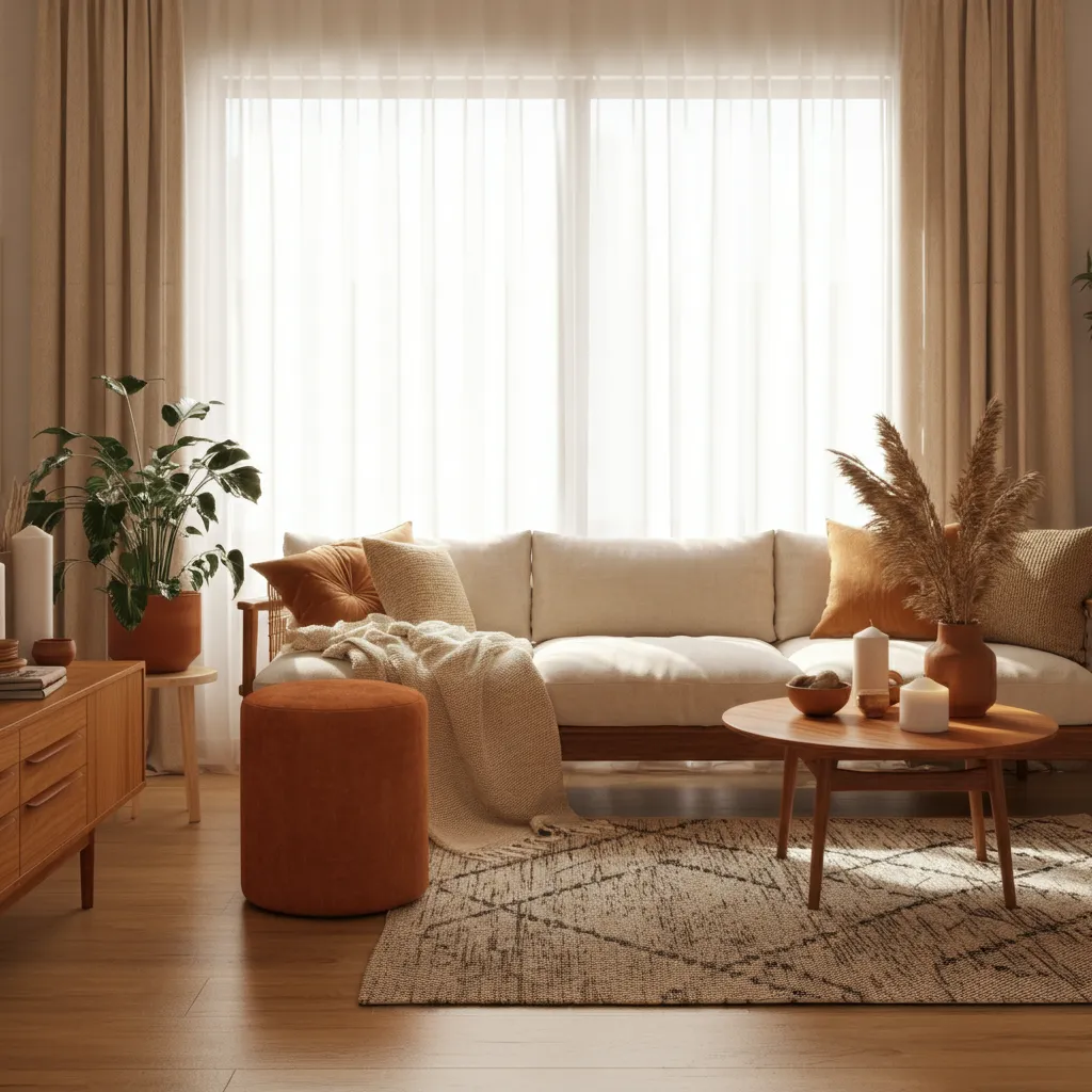 Sheer curtains allow natural light to flood your living room, enhancing the airy, open feel of the space. Choose neutral or earthy tones to keep the look cohesive.
