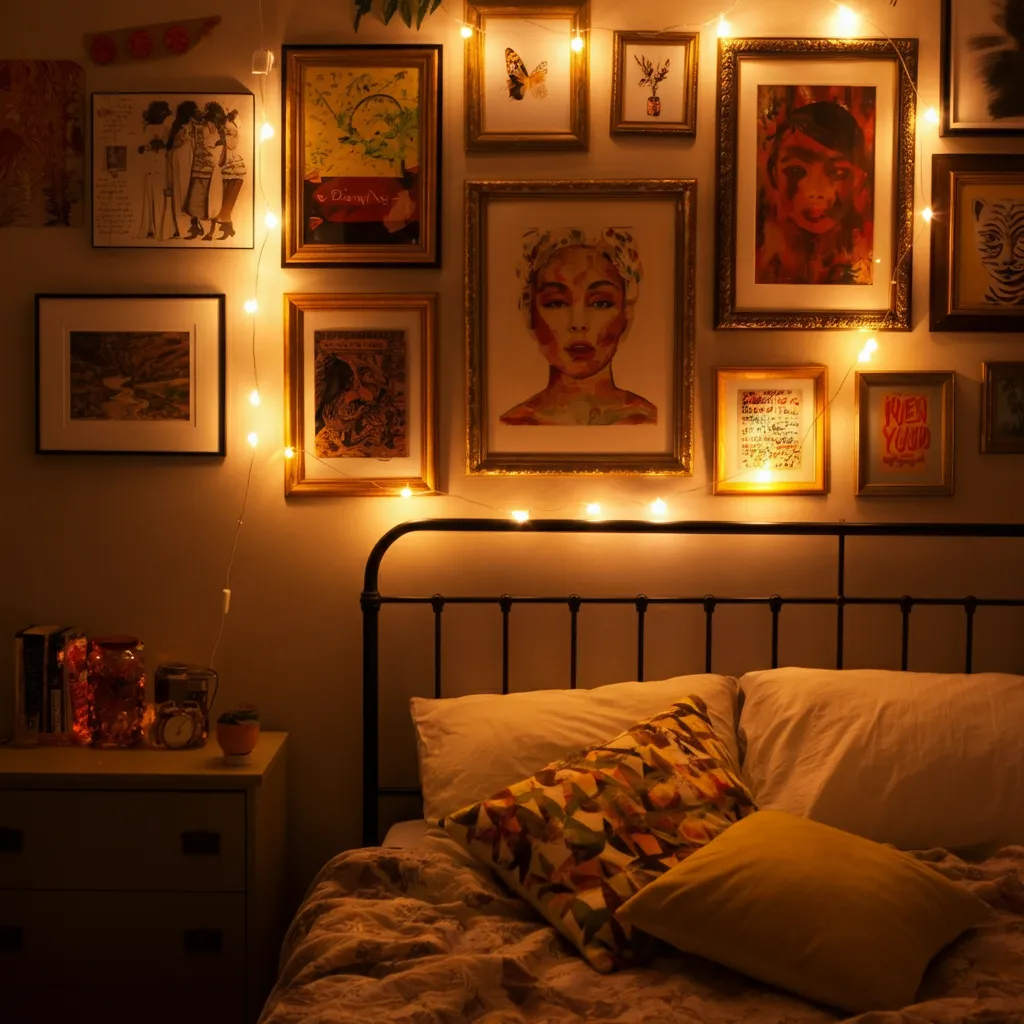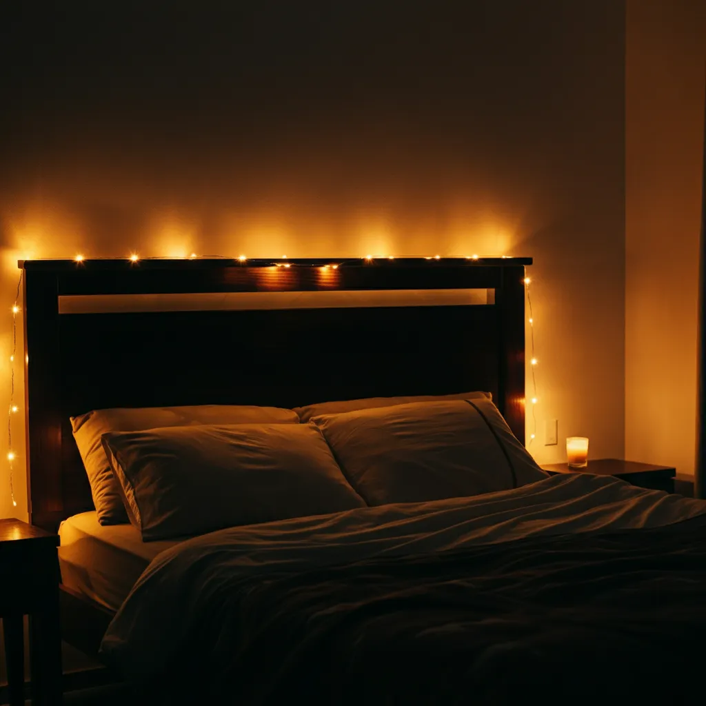 For a touch of whimsy and warmth, hang delicate string lights or fairy lights around your headboard, mirror, or window. They provide a soft, magical glow that’s perfect for relaxing in the evening.