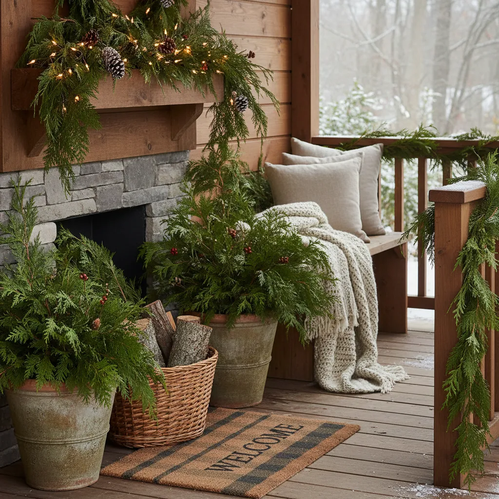 Layer blankets, cushions, and rugs, add candles or fairy lights, and incorporate natural elements like pinecones, branches, or evergreen arrangements to enhance warmth and holiday charm.