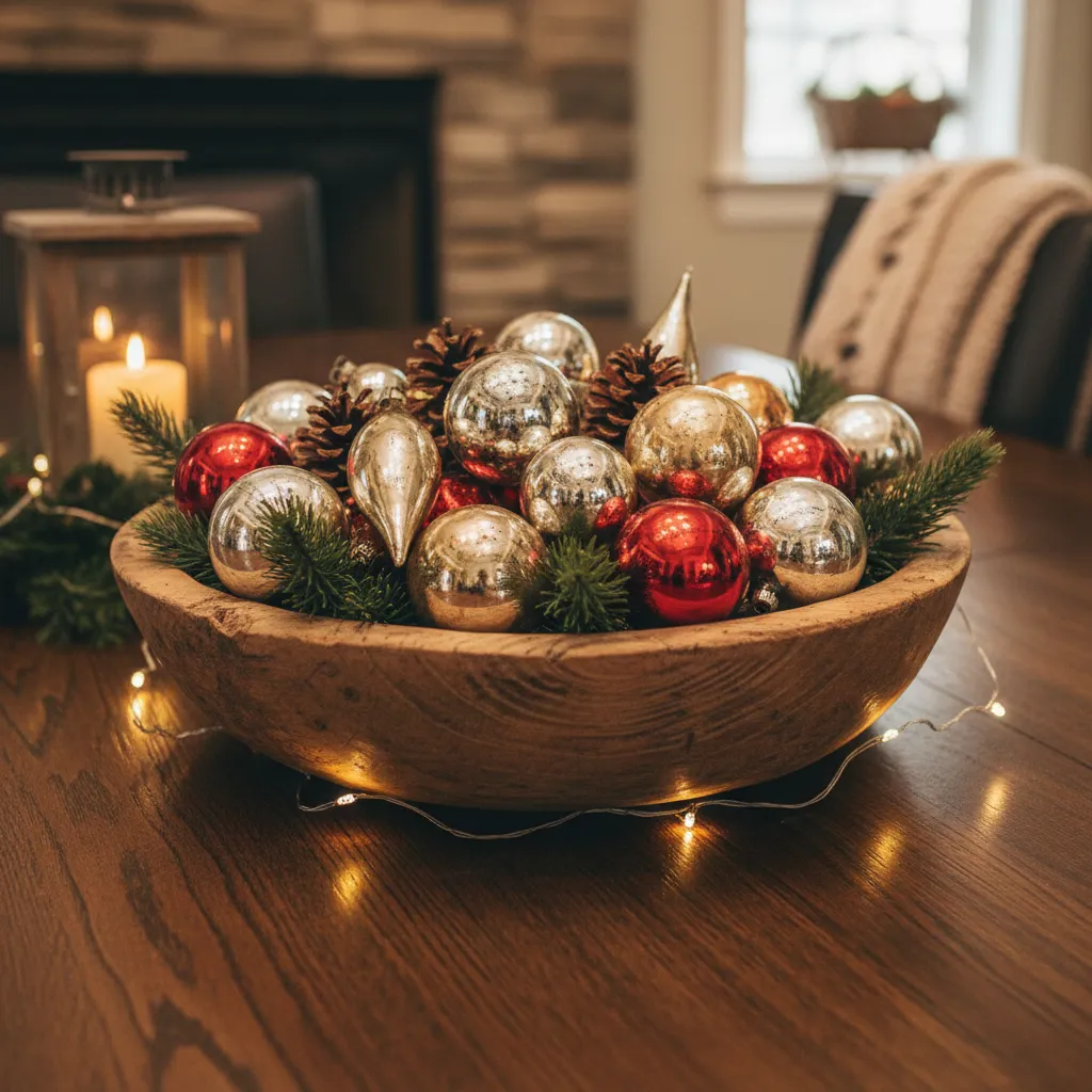 - Wooden Dough Bowls: Heap a mix of vintage ornaments and pinecones in a wooden bowl for a rustic centerpiece.