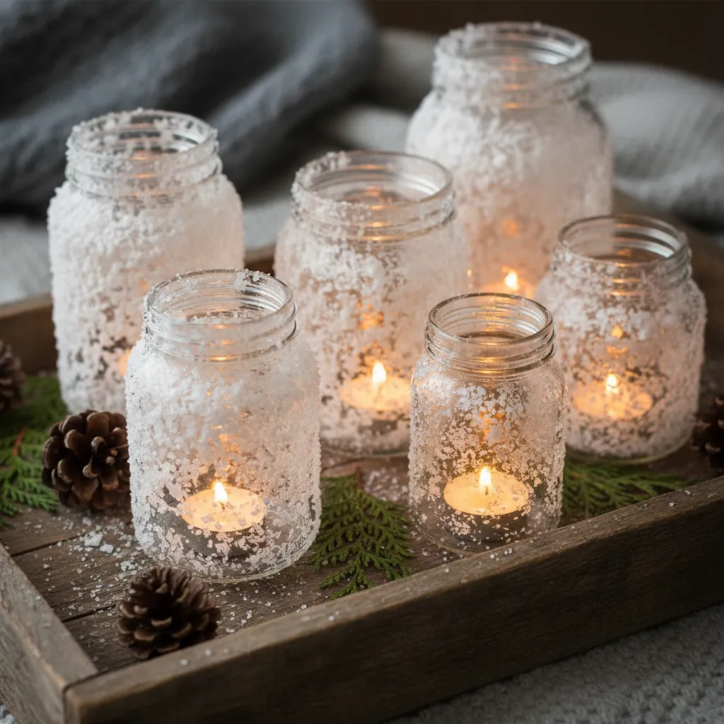 - Epsom Salt “Snow”: Coat the jar in glue and roll it in Epsom salts for a frosty, wintery look.