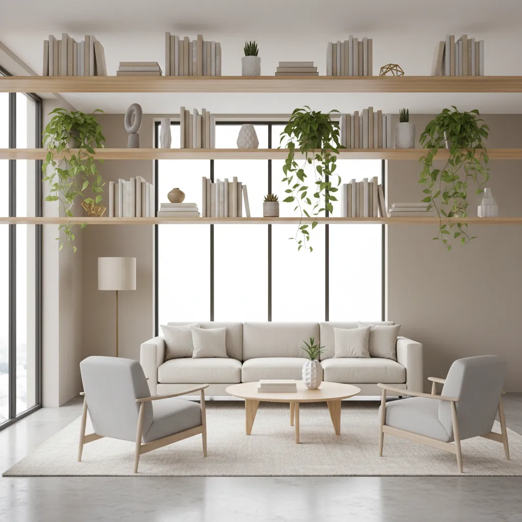 Stop wasting the upper foot of your walls. Install a perimeter of floating shelves a foot below your ceiling. This creates the perfect spot to store books, display seasonal decor, or stash attractive storage bins without eating into your living area.
