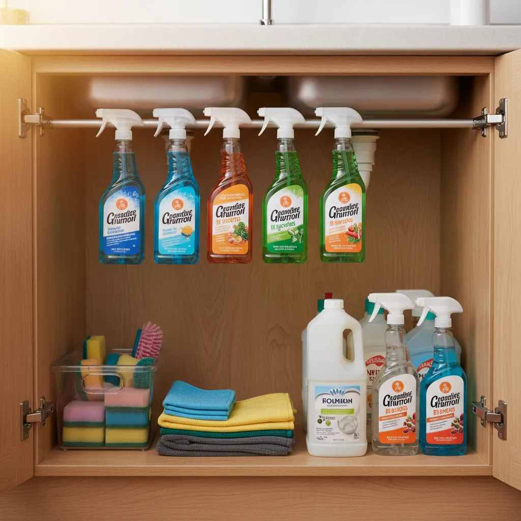 The cabinet under your sink is usually a jumbled mess of cleaning bottles. Install a simple tension rod across the top width of the cabinet and hang your spray bottles by their triggers.