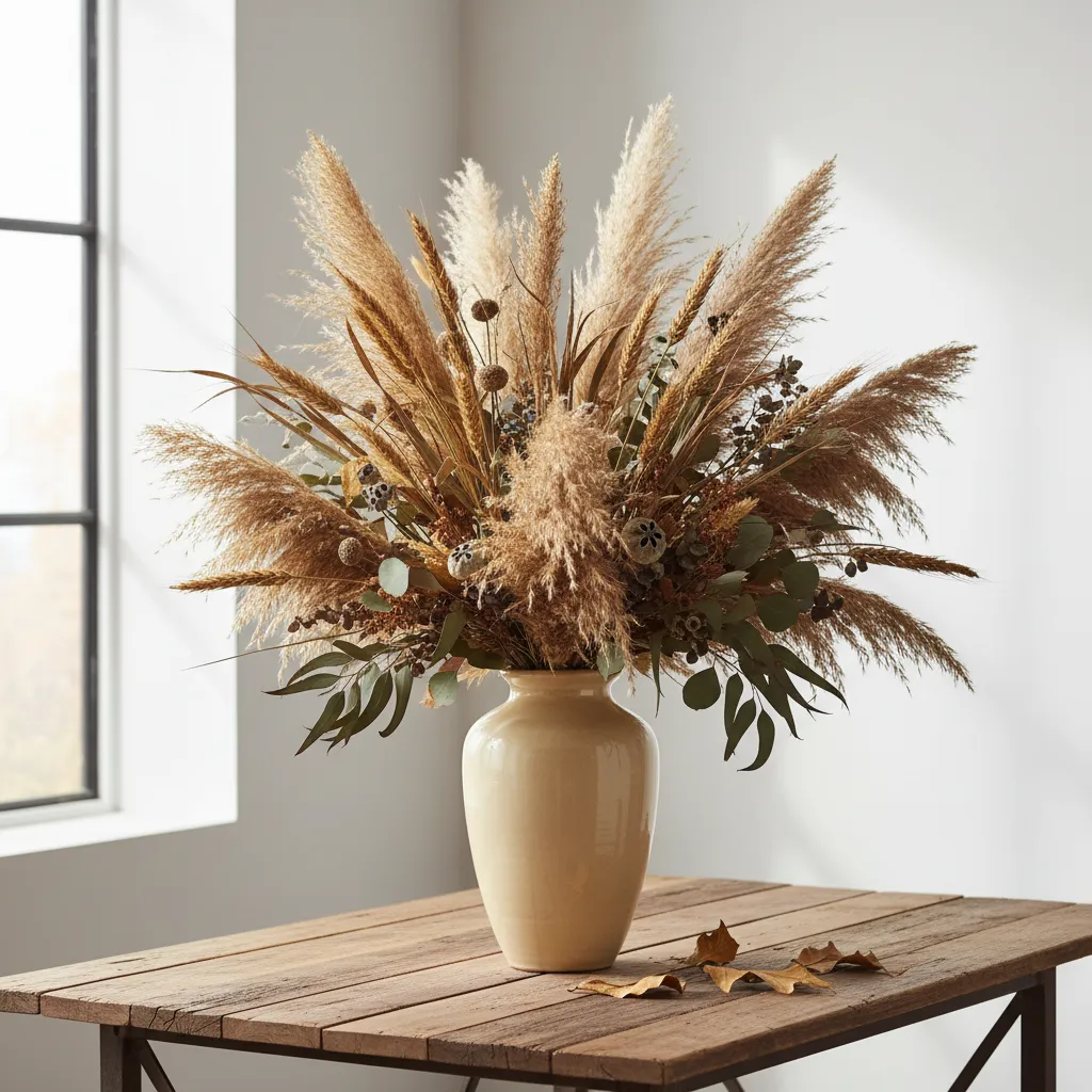 Forage for fallen branches on a walk or pick up some dried eucalyptus, pampas grass, or wheat stalks. Arrange them in a tall vase to create a simple, elegant centerpiece for your dining table or a statement piece for your entryway.