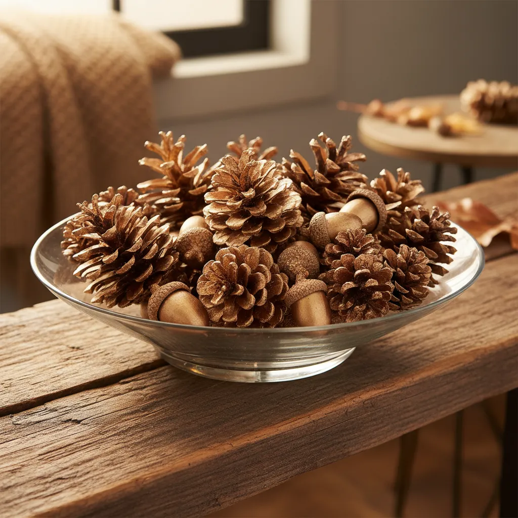 Fill a clear glass bowl or hurricane vase with pinecones and acorns for a rustic and charming accent. You can leave them natural or lightly spray-paint them in metallic gold or copper for a bit of sparkle.