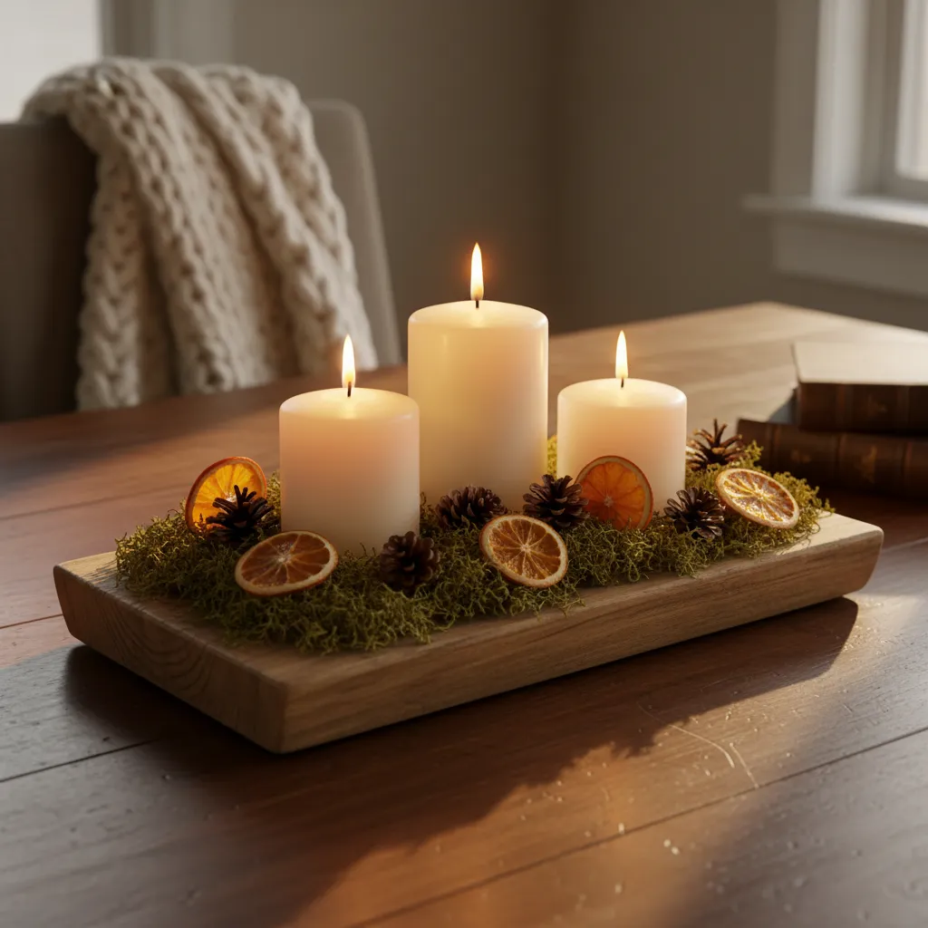 Get creative and make your own centerpiece. Arrange pillar candles of varying heights on a wooden tray and surround them with moss, small pinecones, and dried orange slices. This simple DIY project adds a personal and rustic touch to your dining or coffee table.