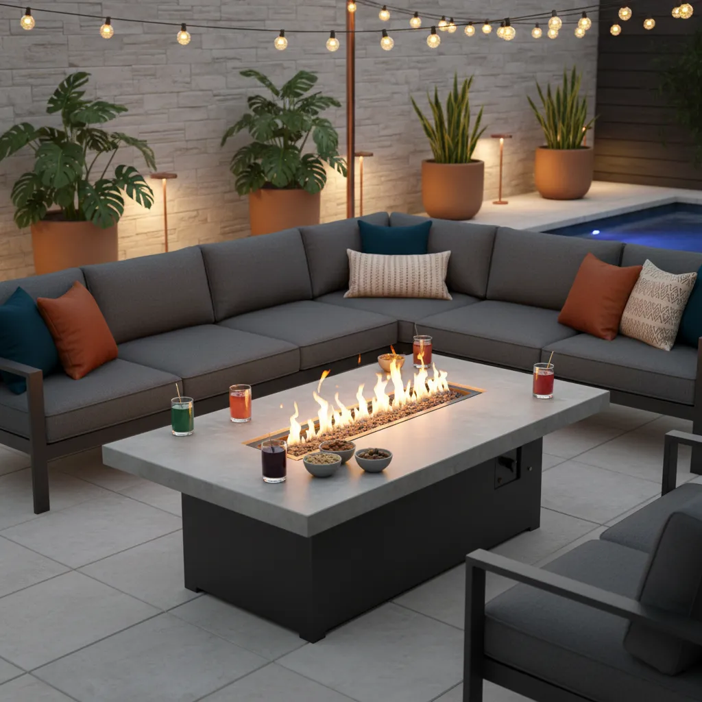 Combine your coffee table and fire pit into one stunning piece. A fire pit table features a central flame with a wide ledge around the perimeter for placing drinks and snacks. It’s the ultimate centerpiece for an outdoor living room, offering both ambiance and functionality.