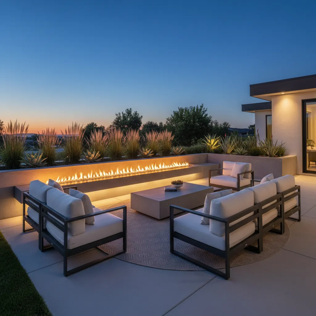 For a sophisticated and upscale look, a long, rectangular gas fire pit is an excellent choice. Often built into a patio seating wall or as a standalone feature, this linear style provides a ribbon of flame that is both elegant and modern. It’s perfect for defining an outdoor seating area.