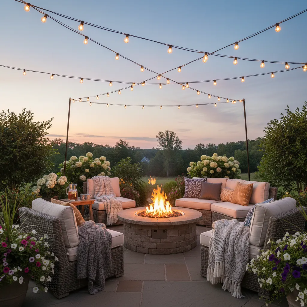 Arrange comfortable seating around the fire pit, add outdoor rugs, cushions, and throws, and include soft lighting such as string lights or lanterns to create a warm, welcoming atmosphere.