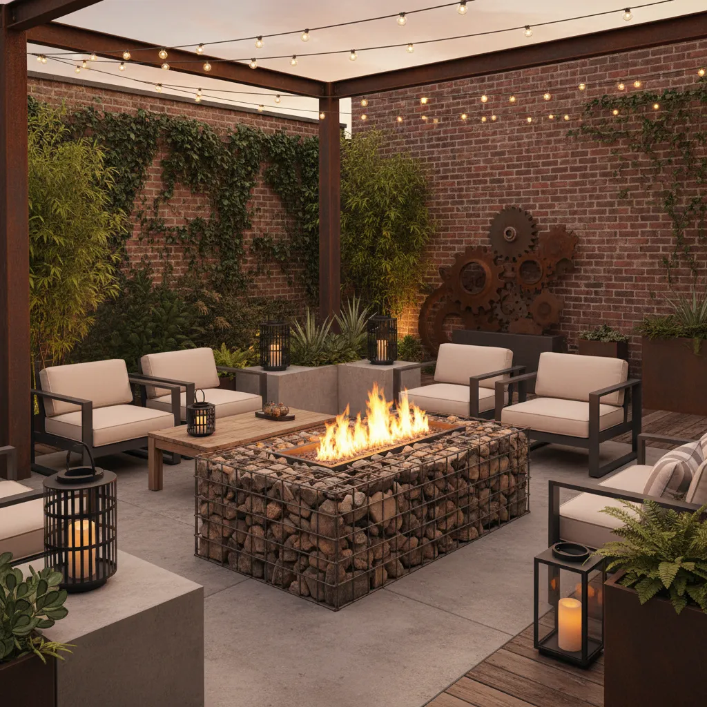 A gabion is a metal cage filled with rocks, and it makes for a unique and industrial-chic fire pit surround. You can choose different colored rocks to match your patio furniture or home exterior. This design is both durable and a fantastic conversation starter.