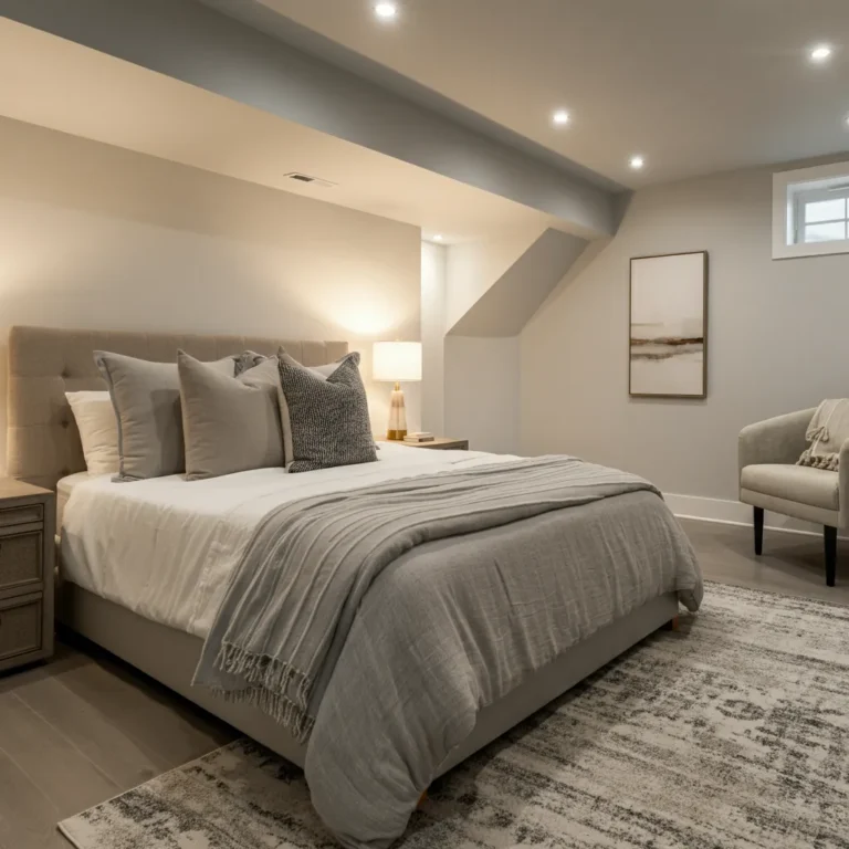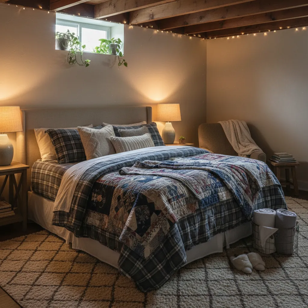 Cozy Factor: Since basements can run cool, layer the bed with heavy quilts, flannel sheets, and a plush area rug underfoot. Warm lighting is crucial here—opt for bedside lamps with 2700K bulbs (soft white) rather than stark overhead lights.