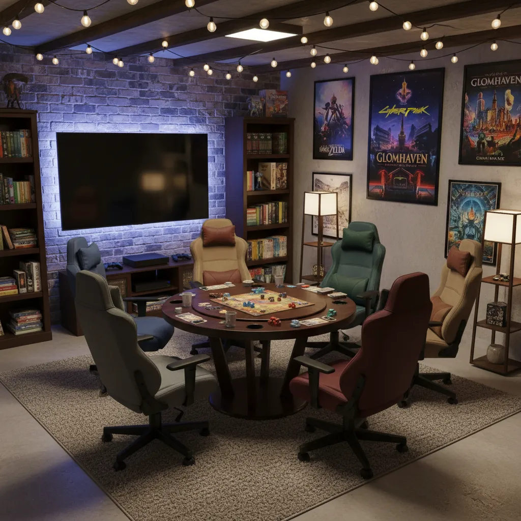 Setup Tip: For board gamers, a round table is best for conversation. For video gamers, invest in specialized gaming chairs and proper cable management solutions. RGB lighting strips behind the TV can add a fun, immersive glow that teens and adults both love.