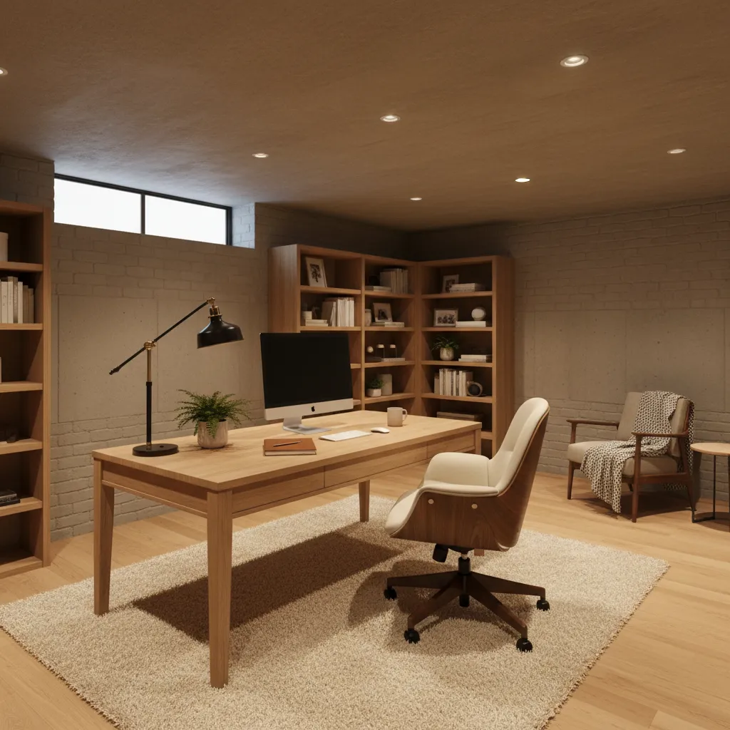 Lighting Strategy: Since natural light is scarce, layer your lighting. You need ambient lighting (ceiling), task lighting (desk lamp), and accent lighting (floor lamp) to prevent eye strain. A light-colored desk and chair can help keep the mood bright and productive.