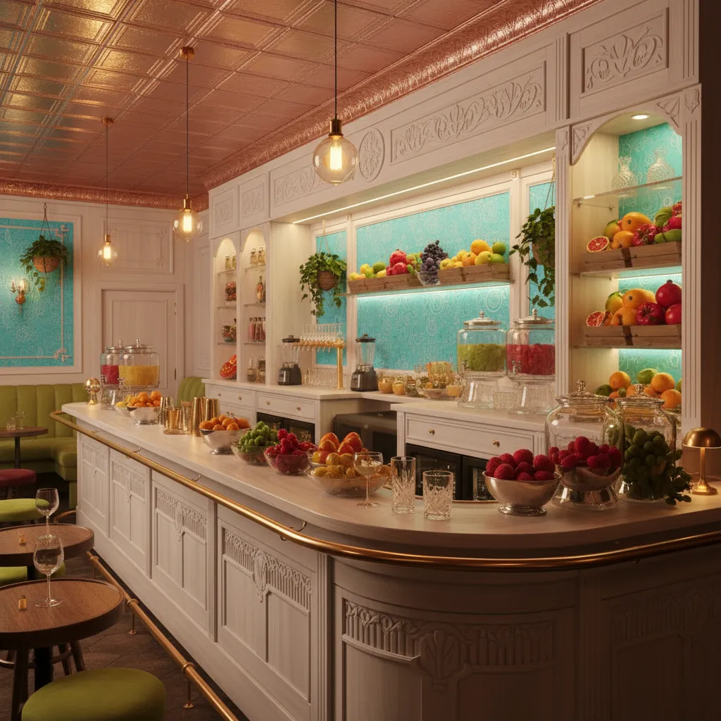 Lean into the lack of natural light by embracing a moody, sophisticated vibe. A basement juice bar doesn’t have to look like a sports pub. Think brass fixtures, dark wood cabinetry, and a mirrored backsplash.