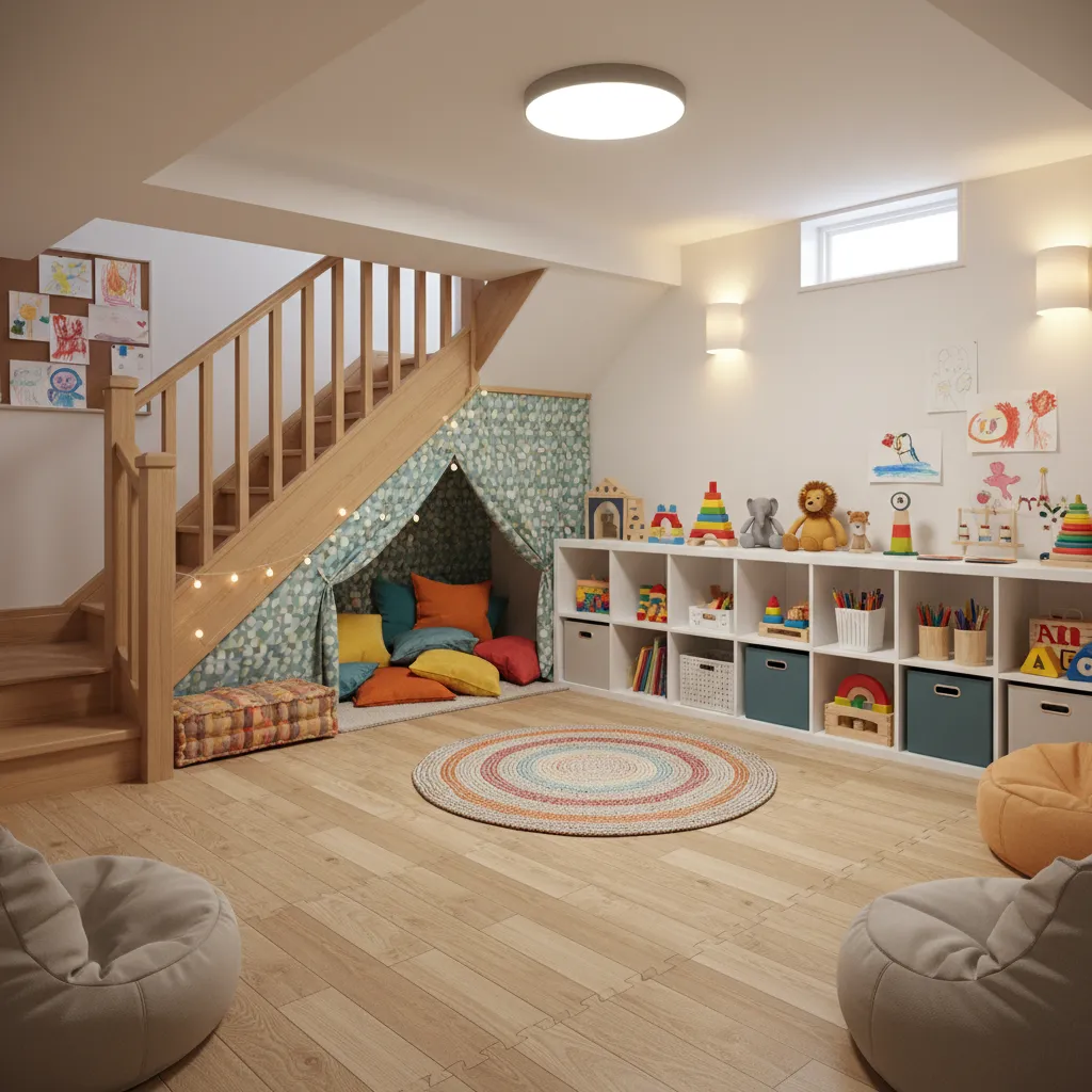 Decor Idea: Create a “fort” area under the stairs using curtains or a custom-built nook. Use soft foam tiles that look like wood flooring for safety that doesn’t sacrifice style. This approach blends practical parenting with stylish home decor.